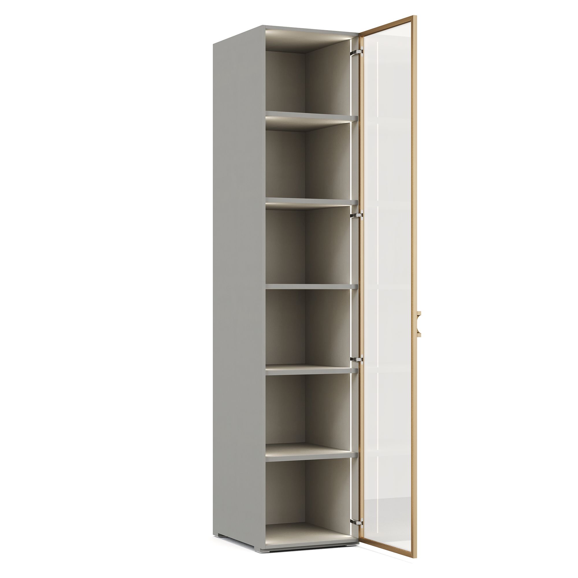 Внутреннее пространство однодверного платяного шкафа TIARA представляет собой систему полок из ЛДСП. Внешний и внутренний декор корпуса выполнен в текстуре Шенилл, повторяющей рисунок натуральной ткани. Фасад модели выполнен из стекла с зеркальным эффектом, тонированного в оттенок Бронза, и оснащен ручкой в отделке Матовое золото. Возможно как правое, так и левое открывание.