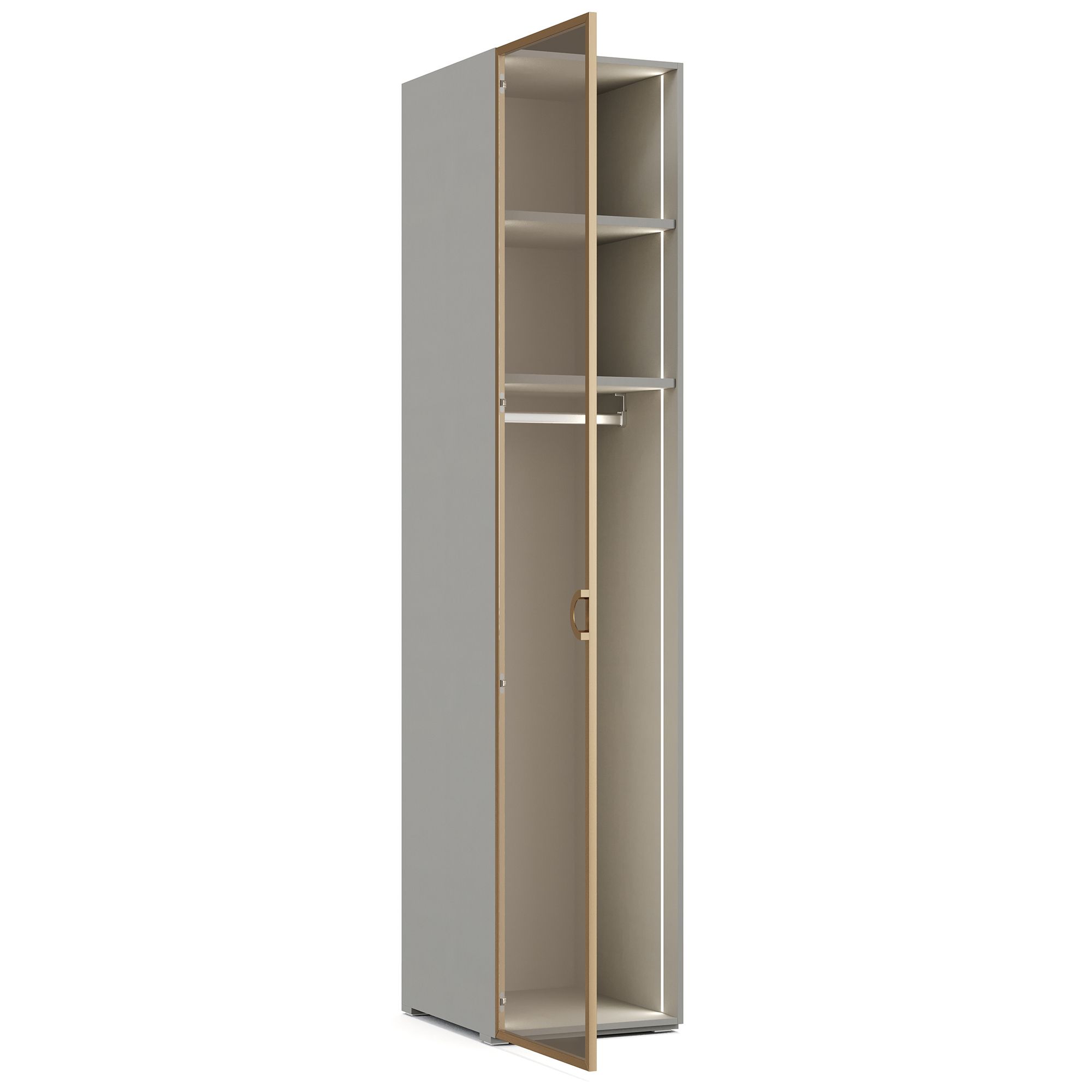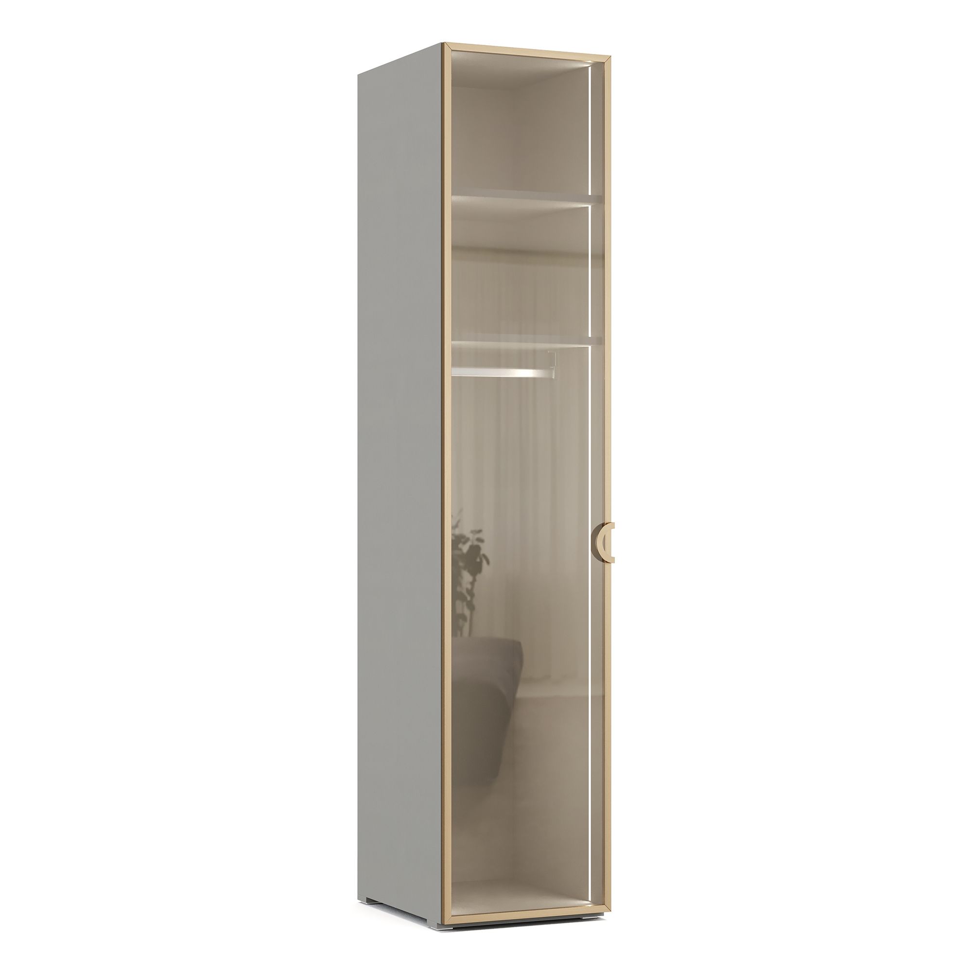 В верхней части однодверного платяного шкафа TIARA расположены две полки, к нижней из которых крепится штанга для вешалок. Внешний и внутренний декор корпуса выполнен в текстуре Шенилл, повторяющей рисунок натуральной ткани. Фасад модели выполнен из стекла с зеркальным эффектом, тонированного в оттенок Бронза, и оснащен ручкой в отделке Матовое золото. Возможно как правое, так и левое открывание. Акцентом служат ручки в отделке Матовое золото.