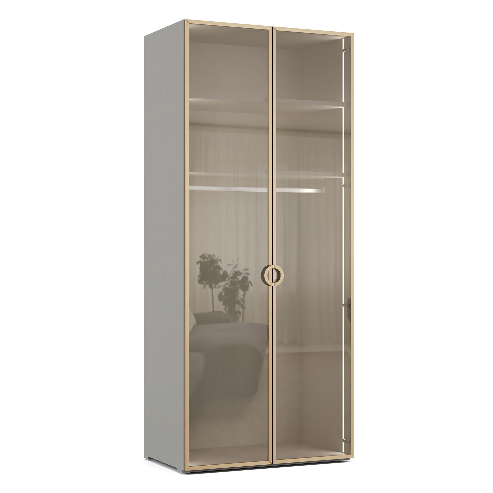 В верхней части двухдверного платяного шкафа TIARA расположены две полки, к нижней из которых крепится штанга для вешалок. Внешний и внутренний декор корпуса выполнен в текстуре Шенилл, повторяющей рисунок натуральной ткани. Фасад модели выполнен из стекла с зеркальным эффектом, тонированного в оттенок Бронза, и оснащен ручкой в отделке Матовое золото. Акцентом служат ручки в отделке Матовое золото.