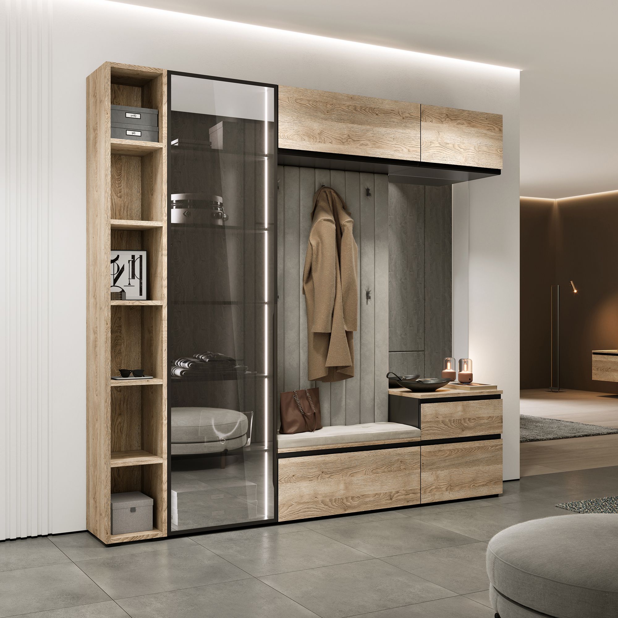 Фасад однодверного шкафа BRUNO выполнен из тонированного стекла с зеркальным эффектом, которое становится полупрозрачным при включении внутренней подсветки. Внутреннее наполнение представляет из себя систему полок. Шкаф оснащается накладной ручкой черного цвета. Возможно исполнение как с правым, так и с левым открыванием.