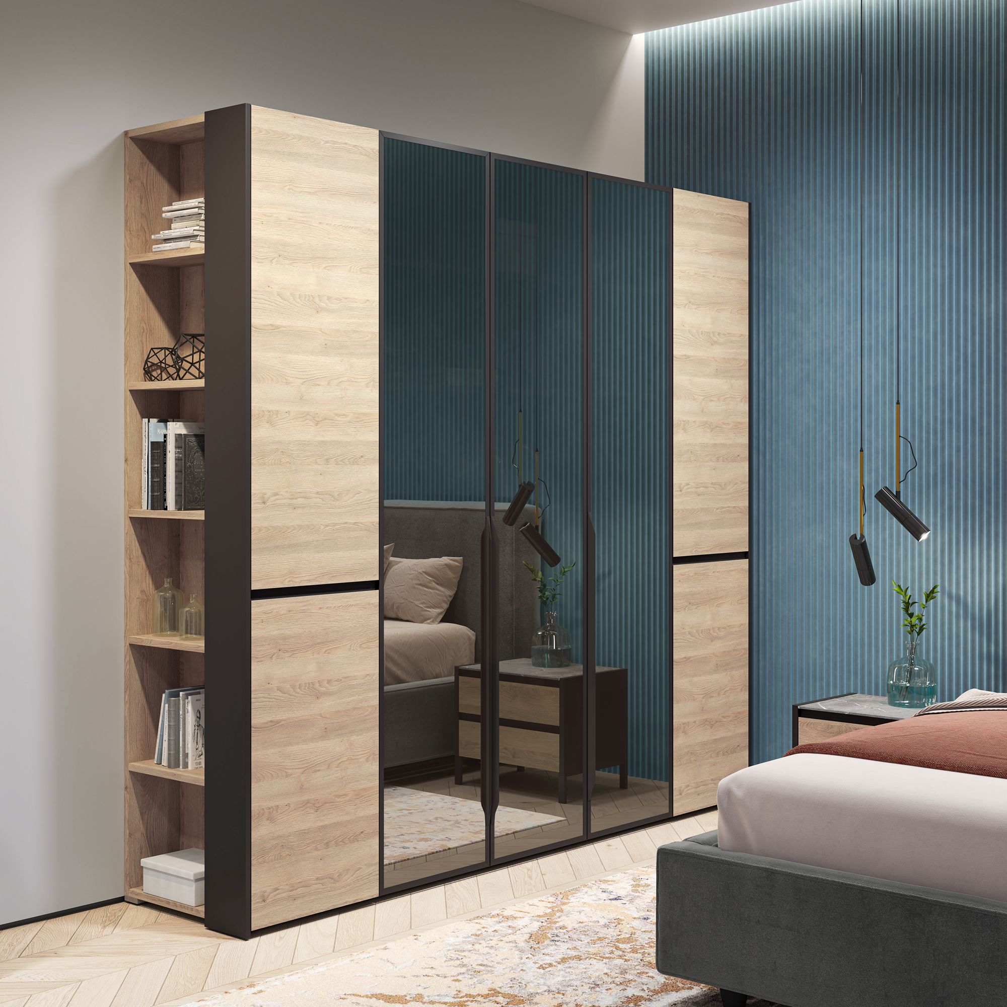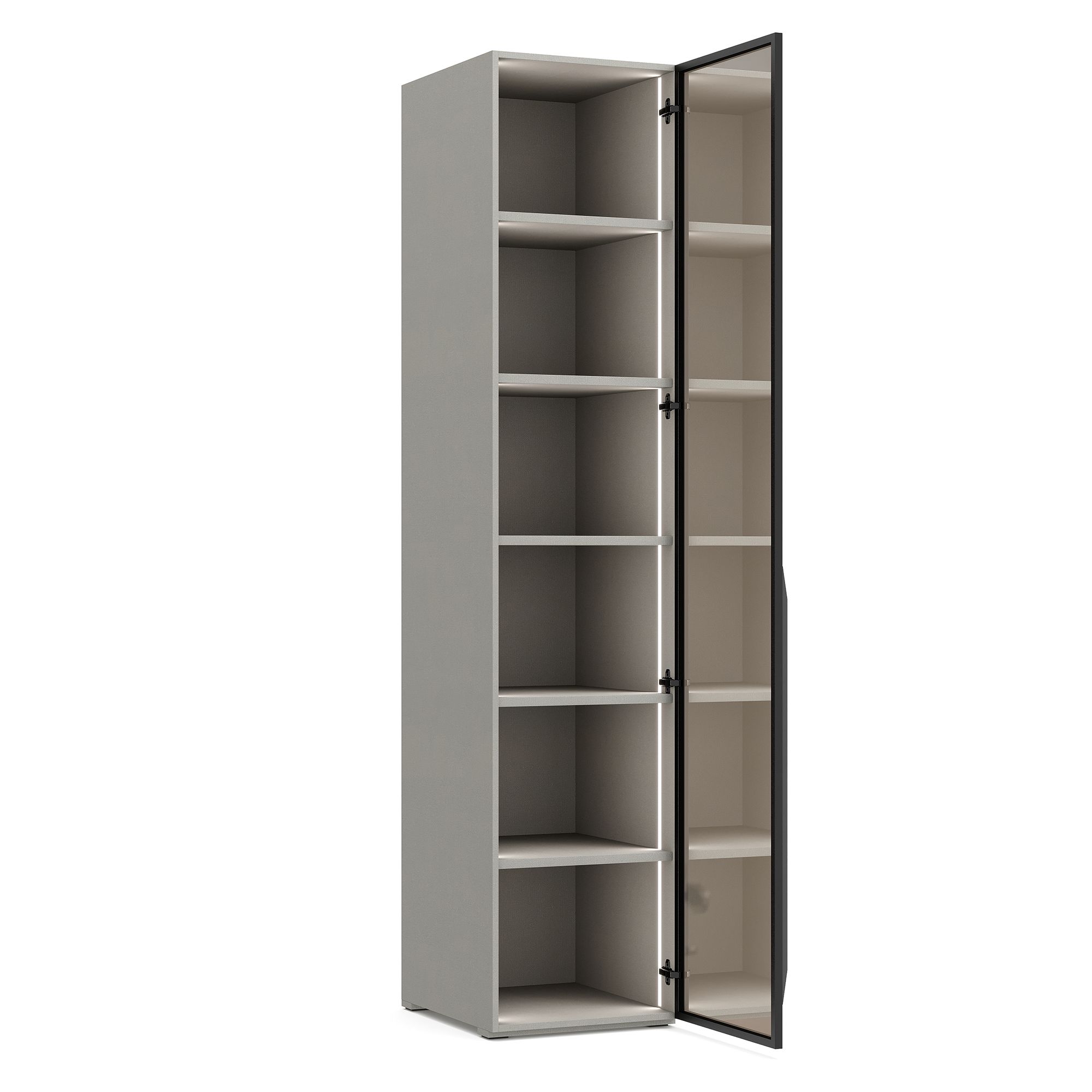 Однодверный шкаф BRUNO с фасадом из тонированного стекла с эффектом зеркала в черном металлическим профиле оснащен пятью полками. Внутреннее пространство шкафа выполнено в отделке текстурой Шенилл. В пазы боковых стенок установлены два светильника. Предусмотрены системы включения при помощи пульта или ножной кнопки (заказываются отдельно). Возможно исполнение как с правым, так и с левым открыванием двери. Глубина шкафа указана без учета фасада. В стоимость изделия включены боковые стенки (2 шт.) в черном цвете (возможна замена на стенку в древесной текстуре).