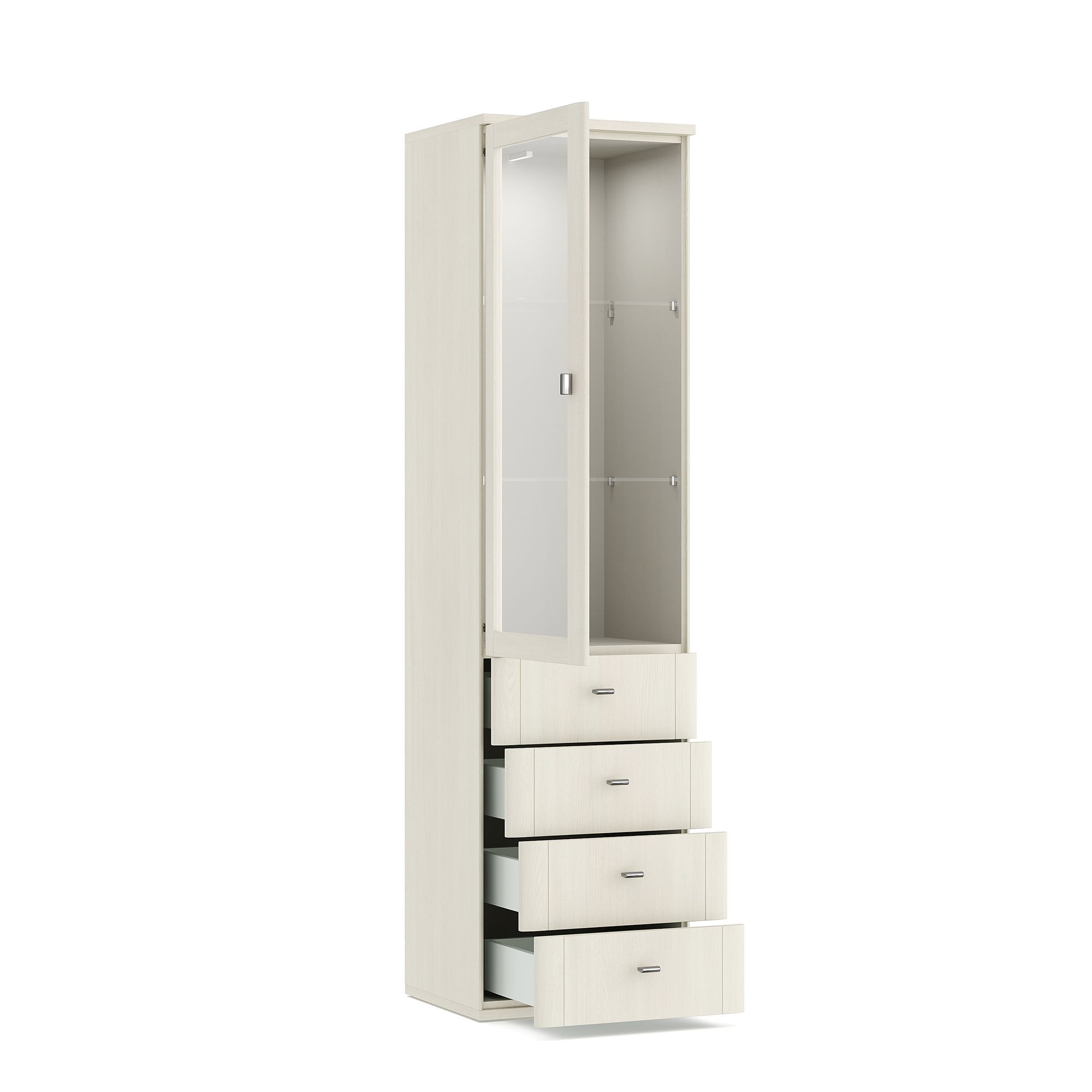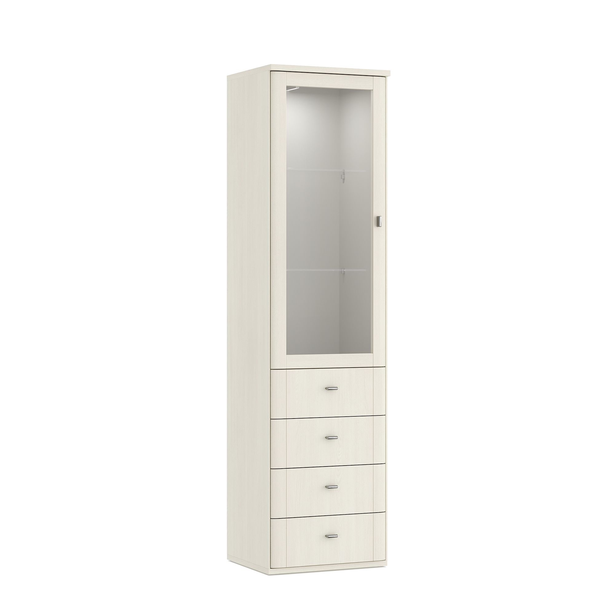 Шкаф-витрина ELEGANTE со стеклянными полками и выдвижными ящиками отлично подходит для посуды и декора. Возможно исполнение как с правым, так и с левым открыванием фасада. Доводчики для плавного закрывания фасадов входят в базовую комплектацию. За плавное открывание выдвижных ящиков отвечают направляющие скрытого монтажа. Дизайн шкафа предусматривает несколько вариантов ручек на выбор. Возможно дополнительное оснащение шкафа системой подсветки (заказывается отдельно).