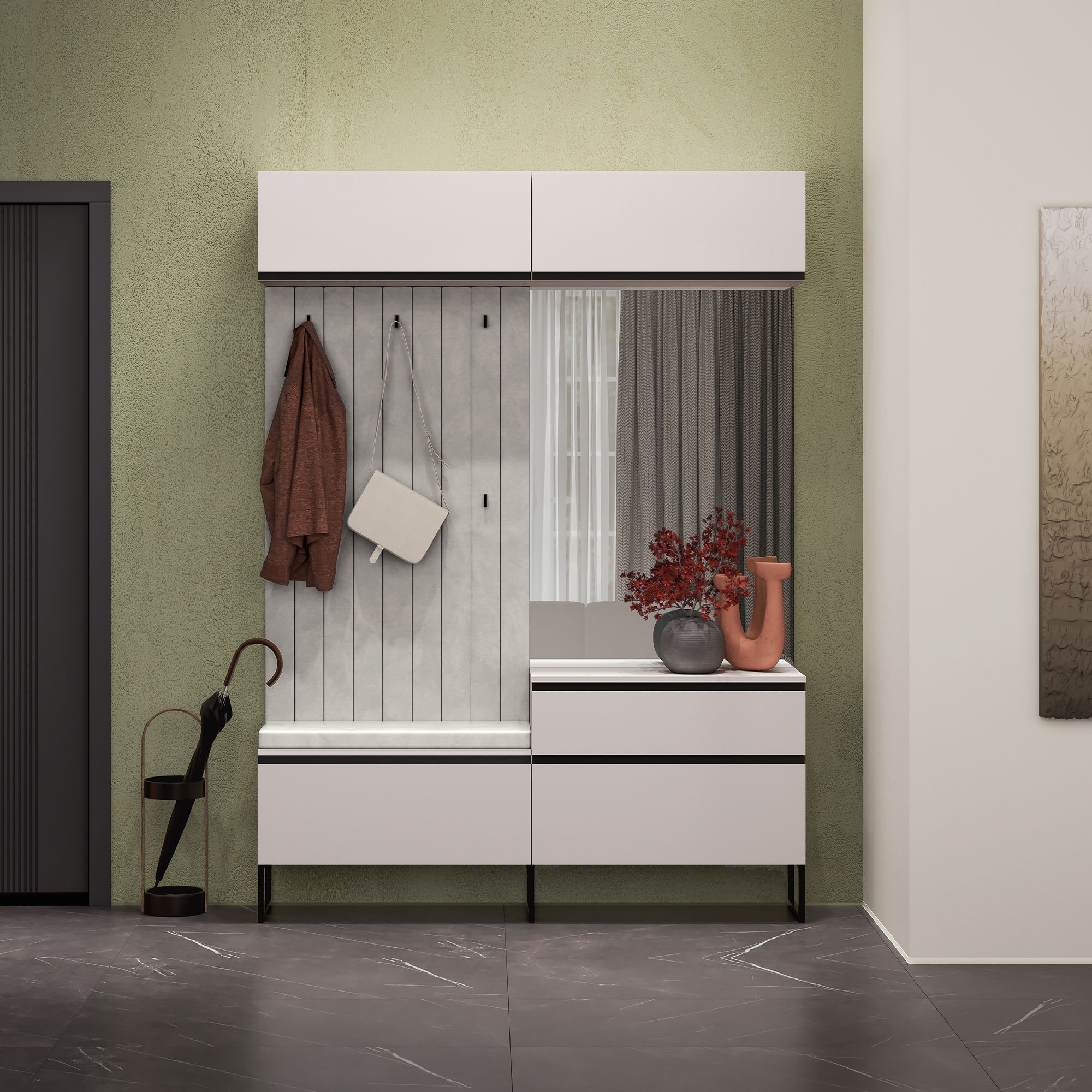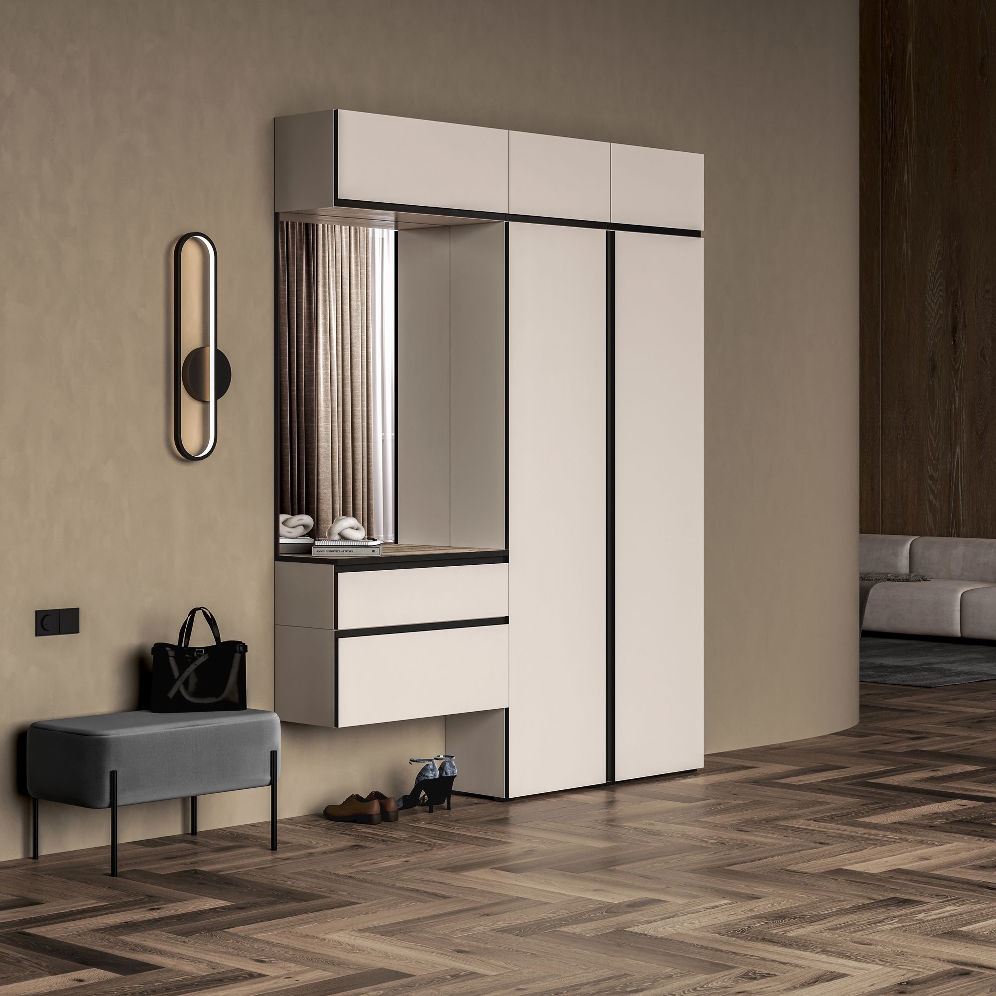 Тактильная матовая поверхность делает взаимодействие с мебелью особенно приятным, а отсутствие лицевой фурнитуры подчеркивает красоту лаконичного дизайна.
