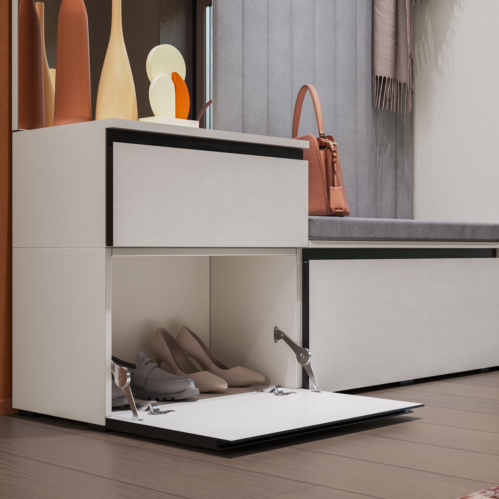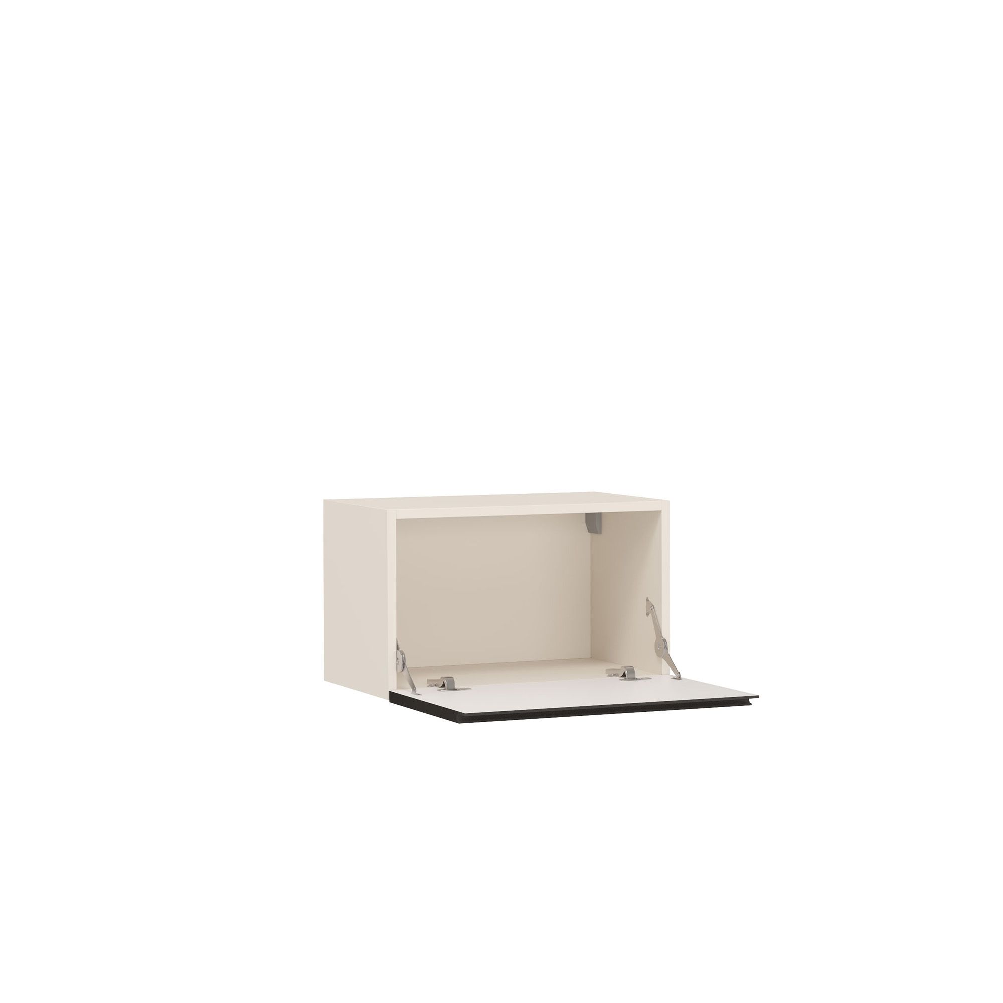 Навесной шкаф ARTA с откидной дверью (открывание вниз) оснащен фасадом с интегрированной J-ручкой графитового цвета. Внутренний декор ящика – текстура Шенилл, повторяющая рисунок плетения натуральной ткани. В стоимость изделия включена крышка в тон корпуса (возможна замена на крышку в текстуре Мрамор Medio). Использование шкафа без этого элемента дизайном не предусмотрено.