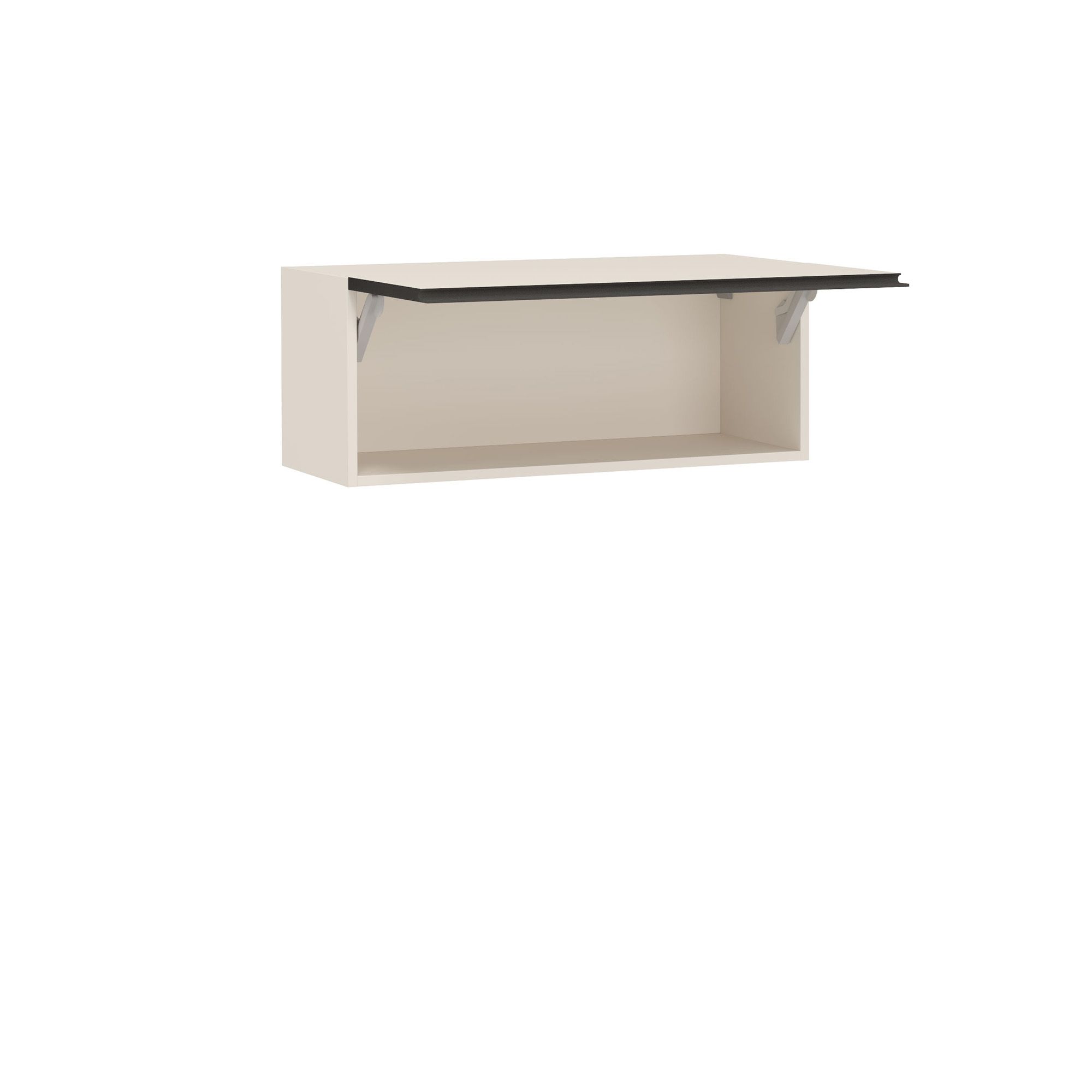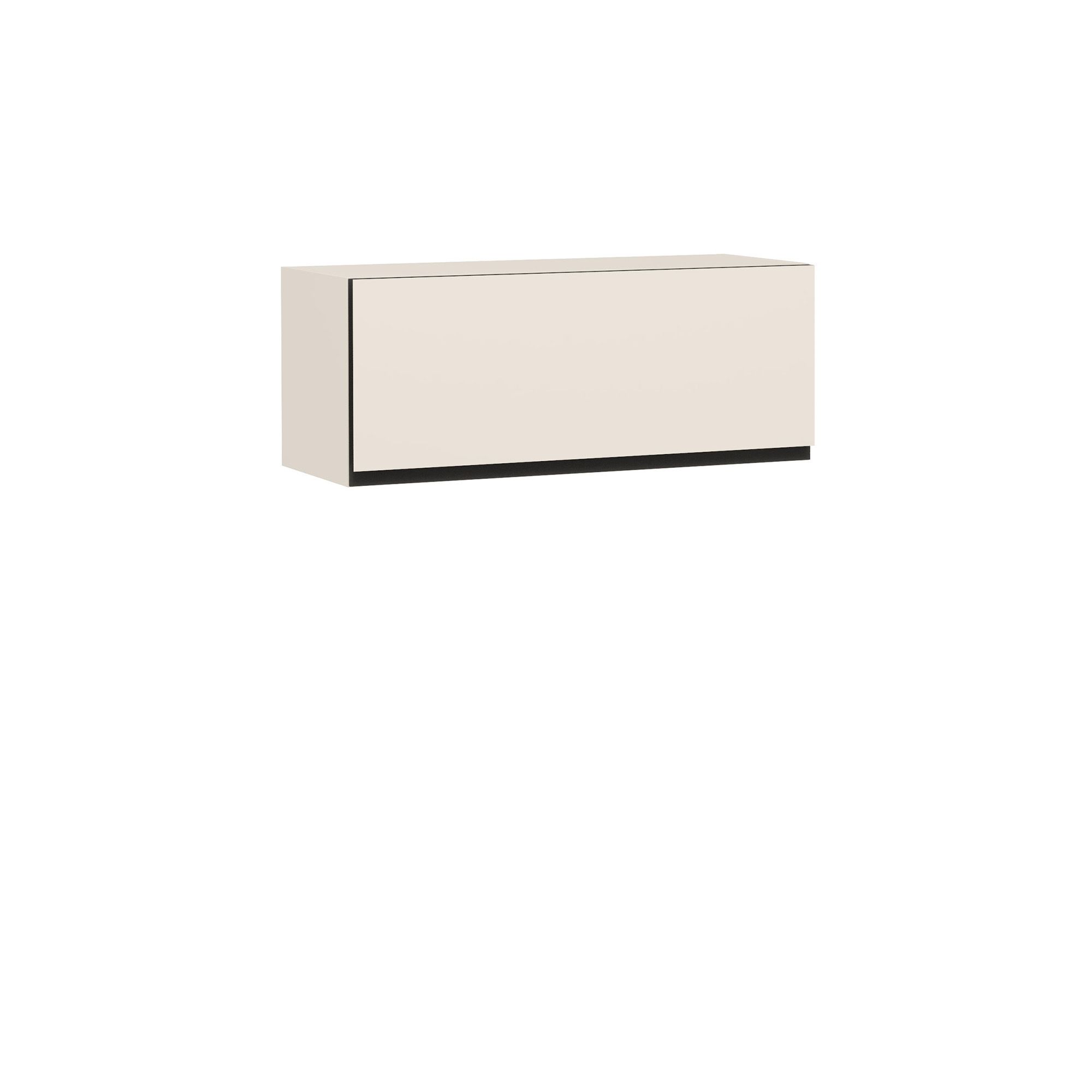 Навесной шкаф ARTA с откидной дверью (открывание вверх) оснащен фасадом с интегрированной J-ручкой графитового цвета. Внутренний декор ящика – текстура Шенилл, повторяющая рисунок плетения натуральной ткани. В стоимость изделия включена крышка в тон корпуса (возможна замена на крышку в текстуре Мрамор Medio). В случае, если шкаф находится выше зоны видимости, применение крышки не обязательно.