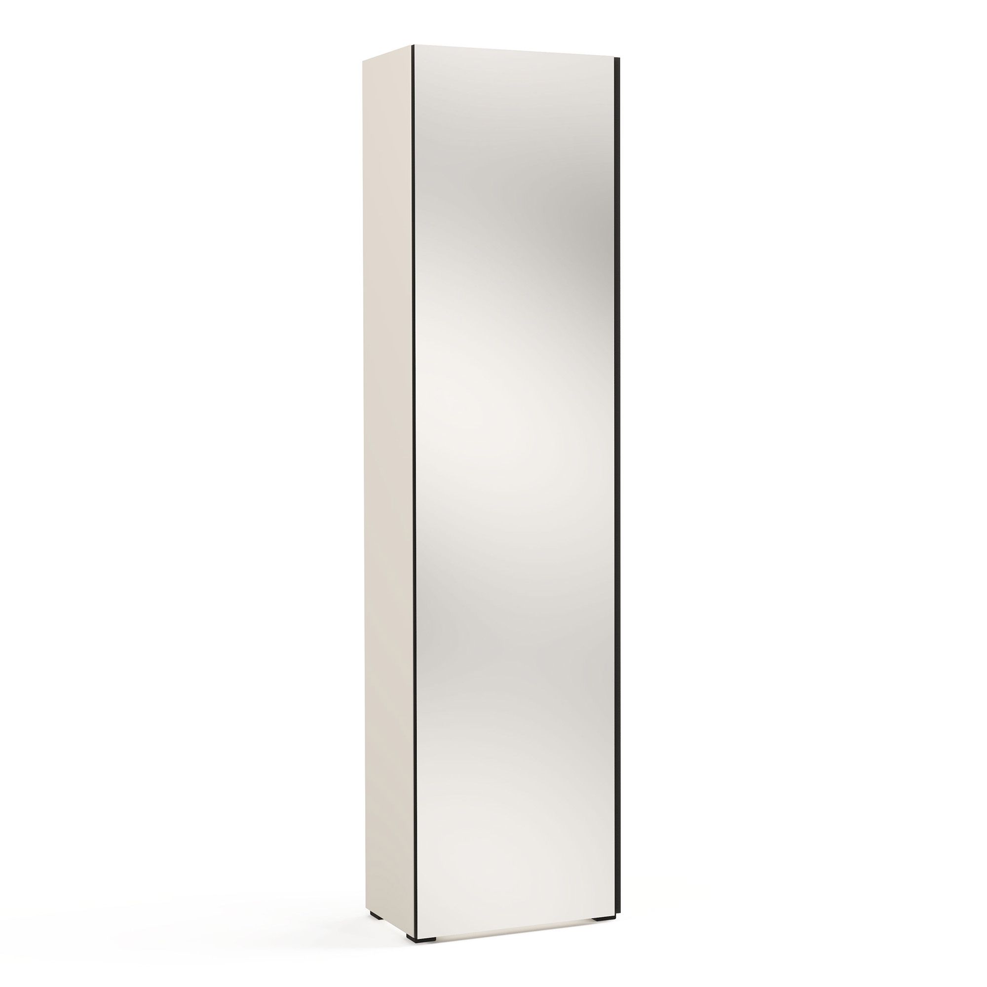 Однодверный шкаф ARTA оснащен зеркальным фасадом, по всей длине которого располагается вертикальная J-ручка графитового цвета. Внутреннее наполнение элемента представляет собой систему полок из ДСП.