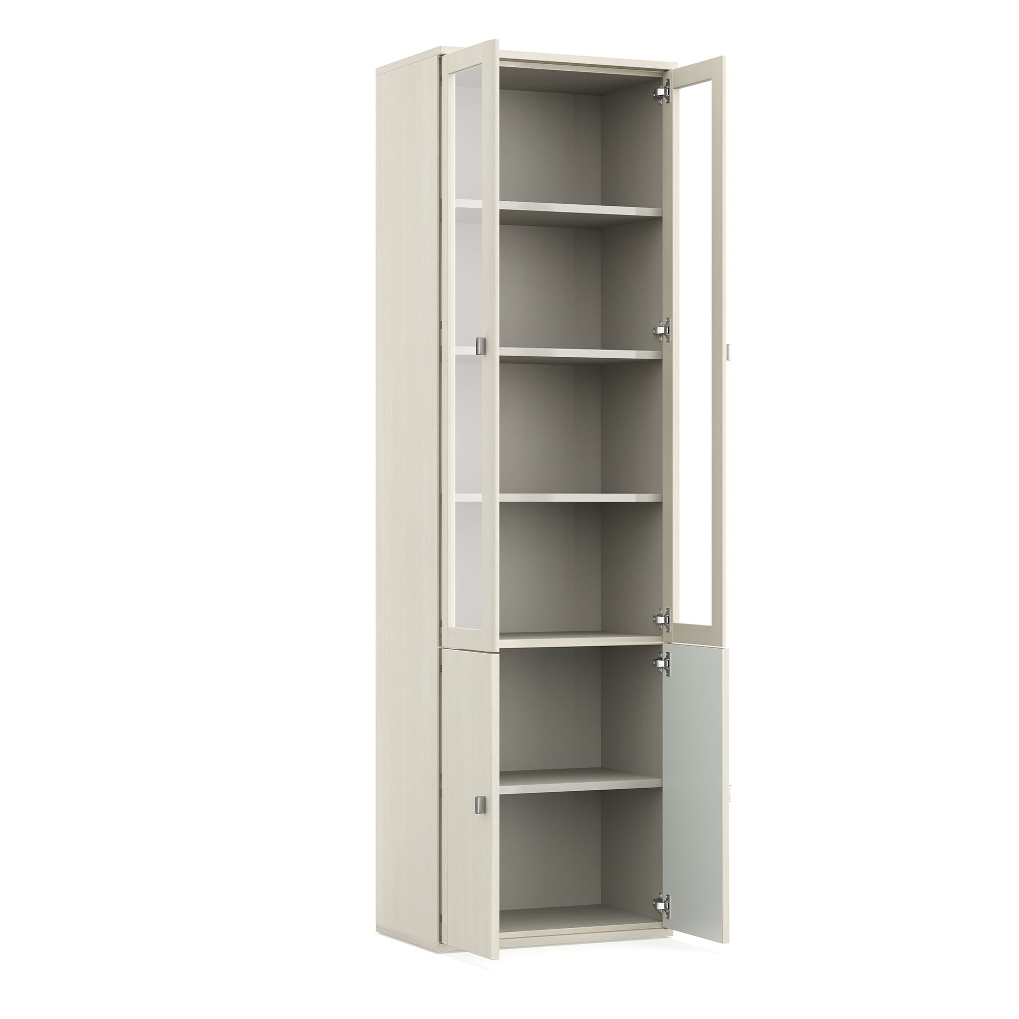 Шкаф-витрина ELEGANTE с распашными фасадами отлично подходит как для гостиных, так и для молодежных комнат, домашних библиотек и рабочих кабинетов. Внутреннее пространство шкафа представляет собой систему полок. Доводчики для плавного закрывания фасадов входят в базовую комплектацию. Дизайн шкафа предусматривает несколько вариантов ручек на выбор.