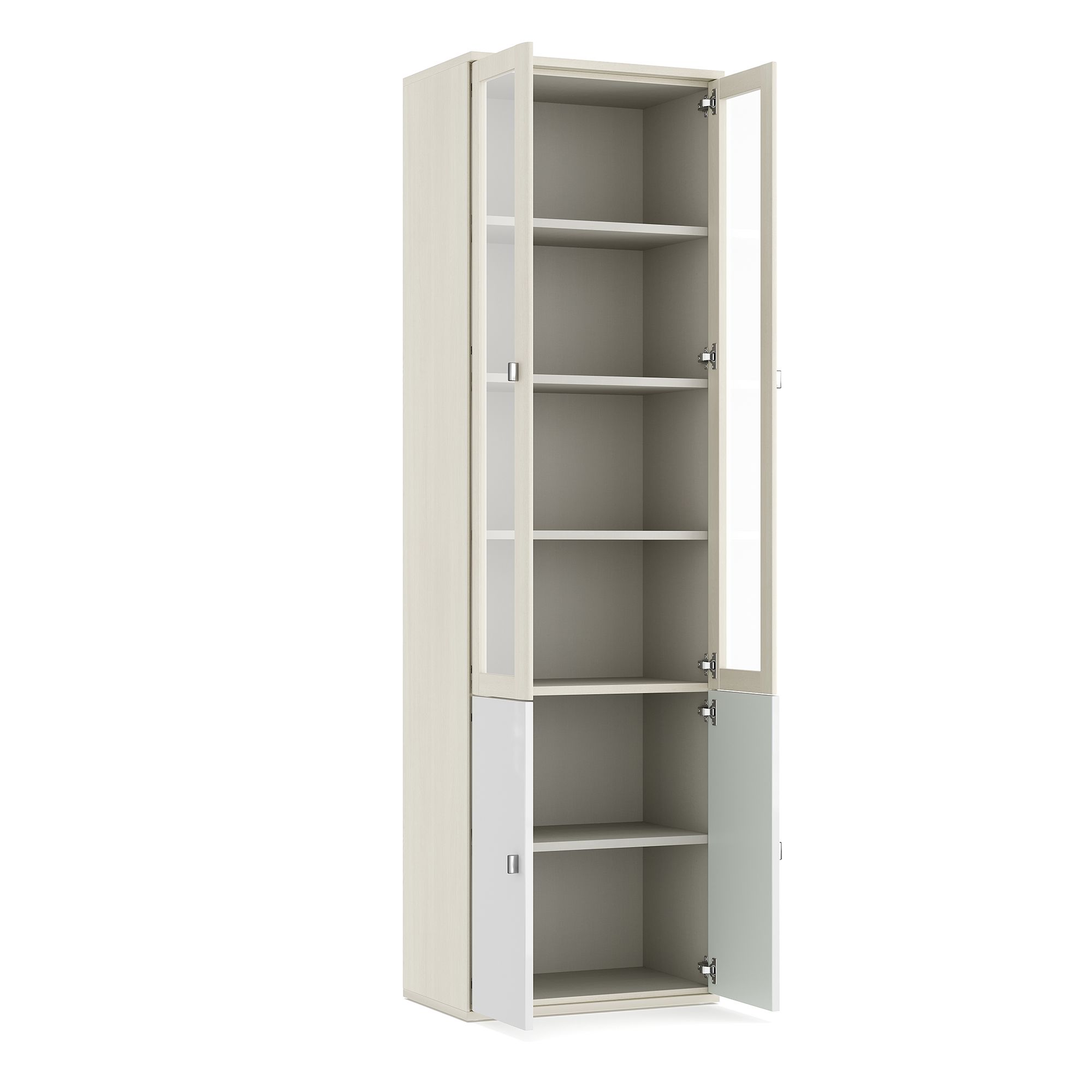 Шкаф-витрина ELEGANTE с распашными фасадами отлично подходит как для гостиных, так и для молодежных комнат, домашних библиотек и рабочих кабинетов. Внутреннее пространство шкафа представляет собой систему полок. Доводчики для плавного закрывания фасадов входят в базовую комплектацию. Дизайн шкафа предусматривает несколько вариантов ручек на выбор.