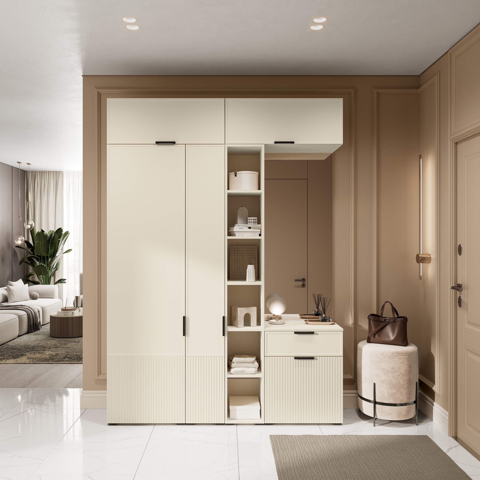 Коллекция включает мебель для спальни, гостиной, прихожей и рабочего кабинета, что позволяет оформить квартиру в едином стиле, создать интерьер для пространства свободной планировки или сделать одно помещение мультифункциональным, объединив в нем элементы различных жилых зон. Дизайн с использованием модулей различной глубины, переходных модулей и антресолей обеспечивает возможность решения любых интерьерных задач с сохранением преемственности и композиционной цельности.
