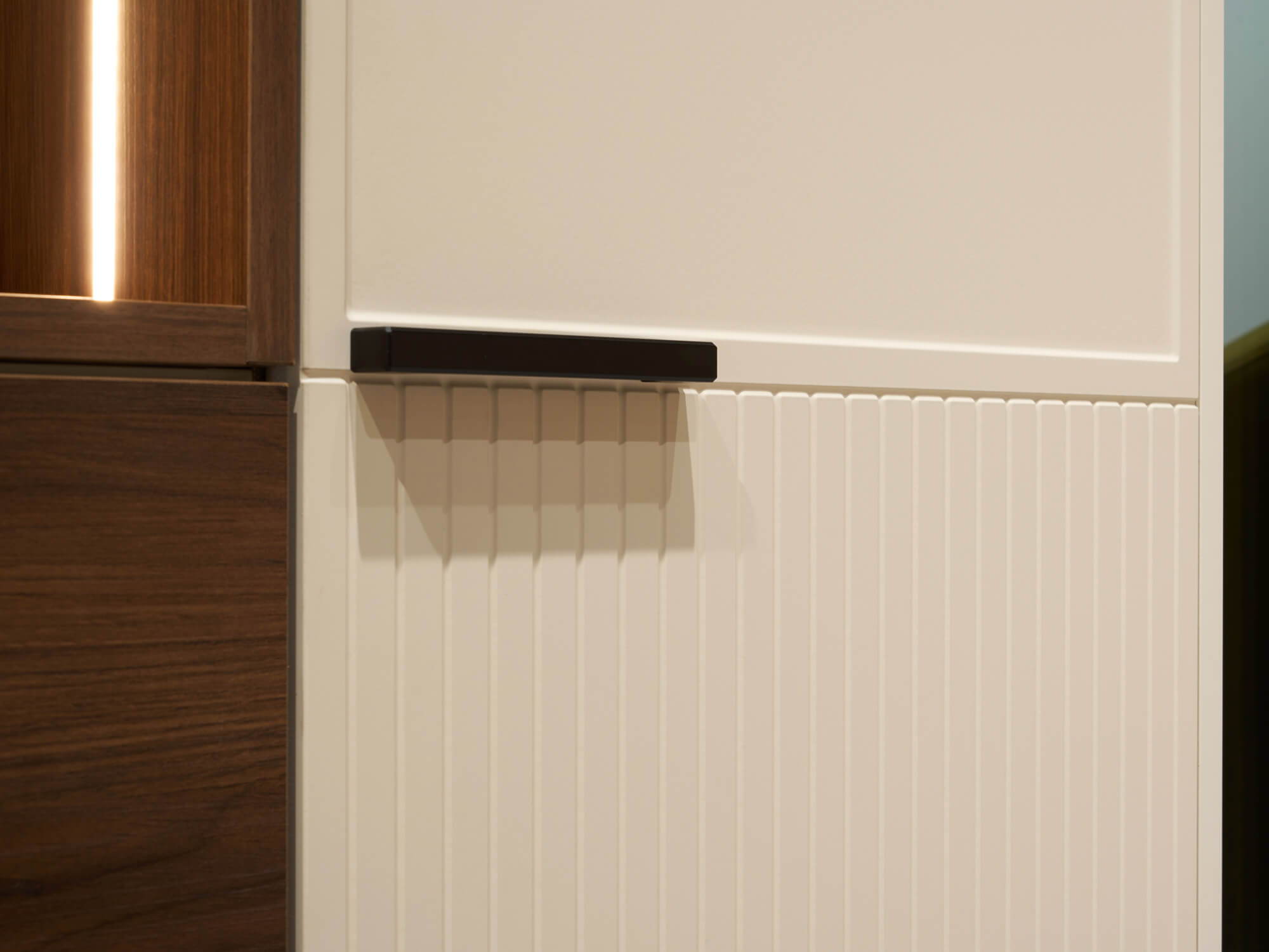 Трендовый декор в виде вертикальных фрезерованных полосок на фасадах задает пространству современный ритм, одновременно создавая ощущение спокойствия, размеренности и стабильности. За счет сочетания гладкой и рельефной поверхностей интерьер приобретает многомерность и глубину.