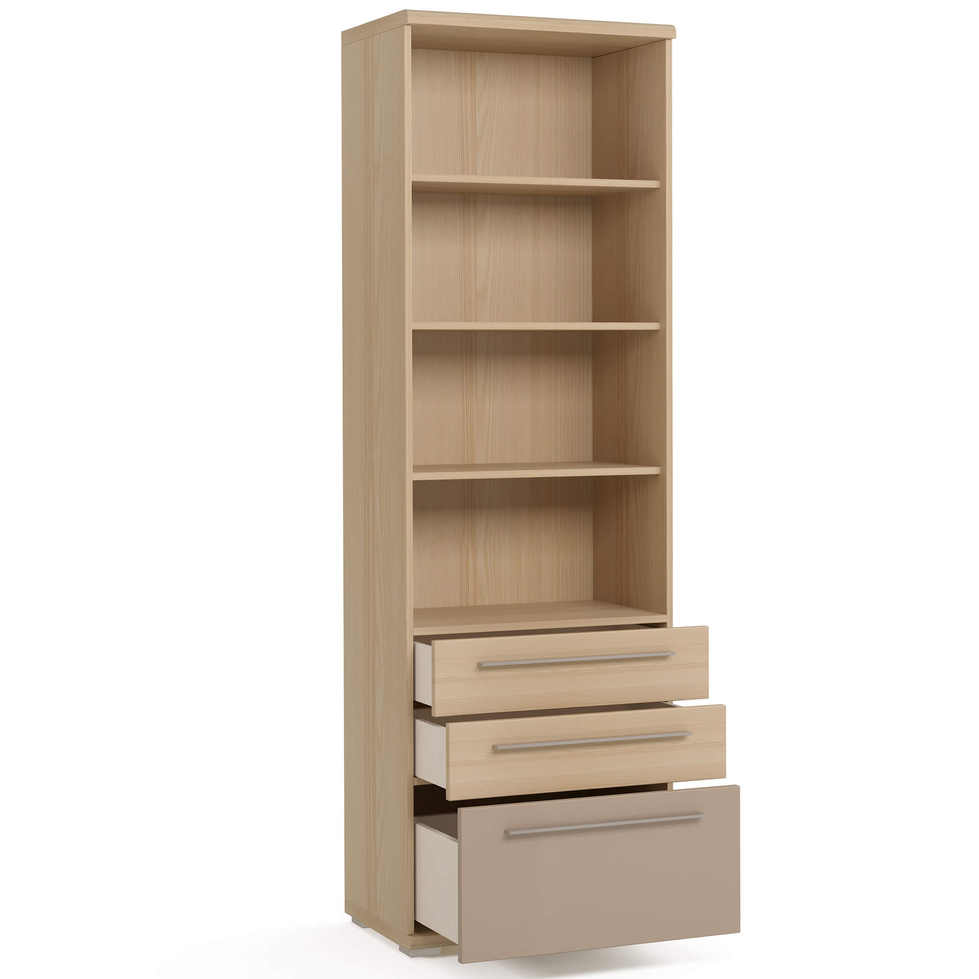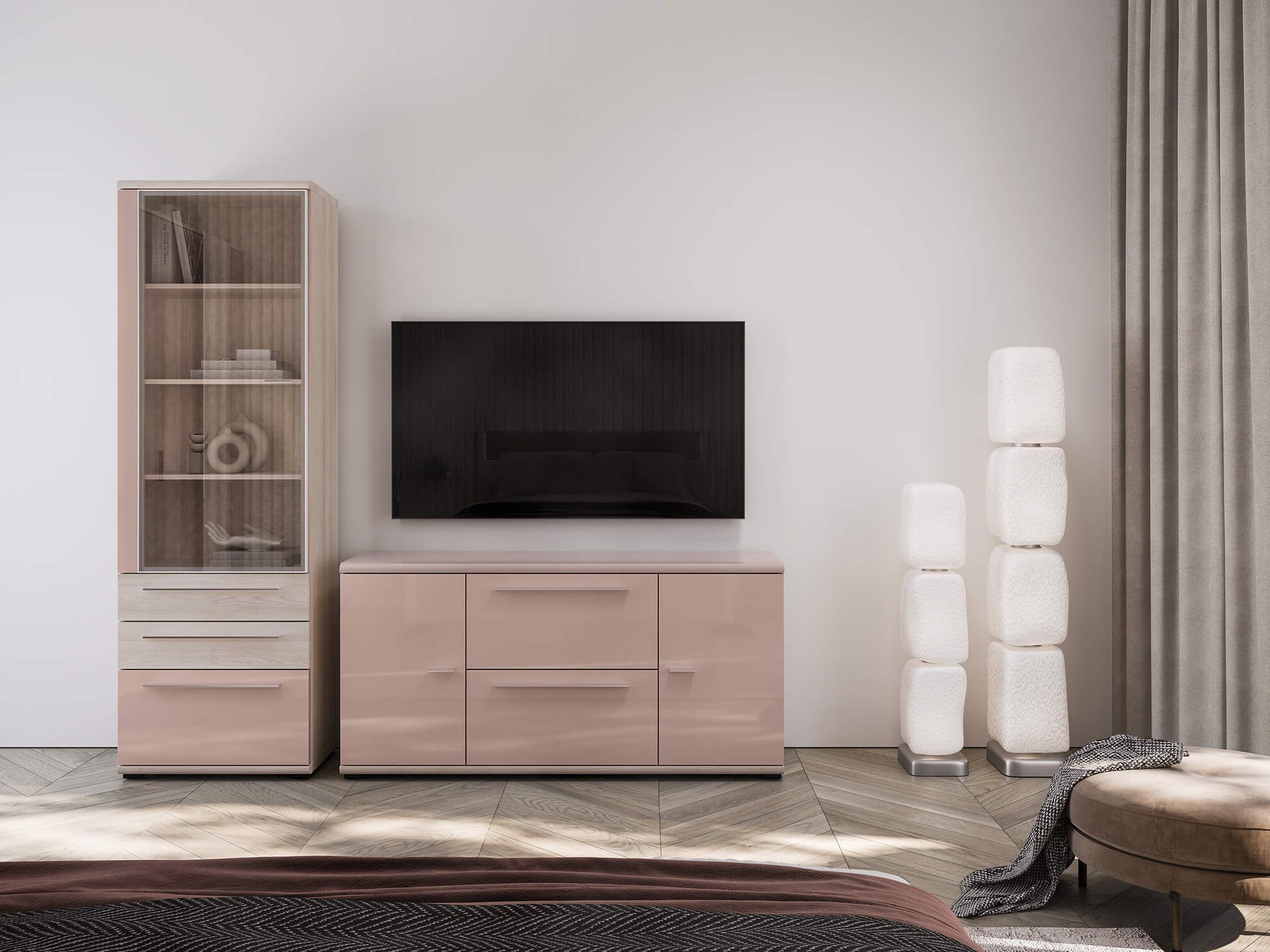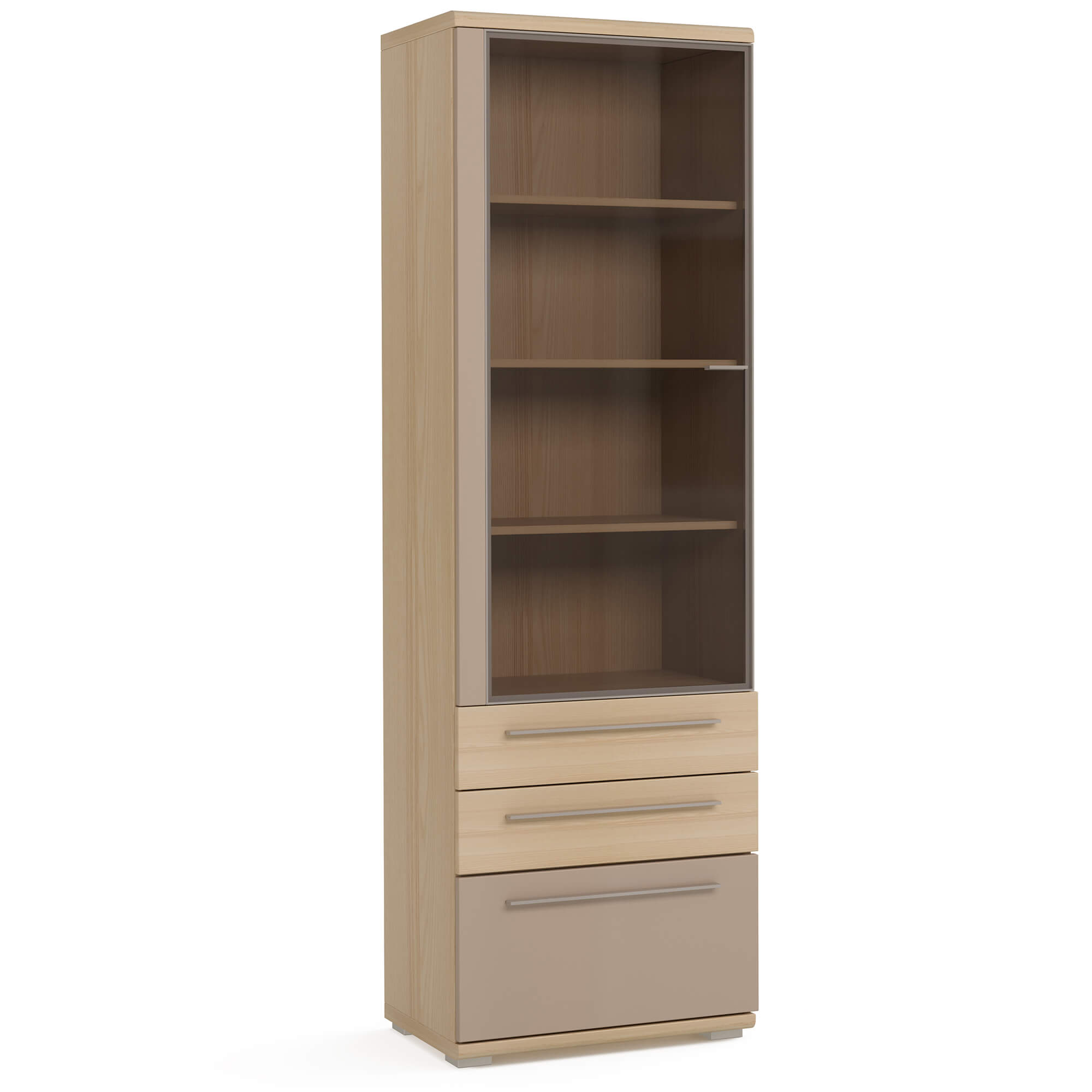 Шкаф-витрина ESTE оснащен распашным фасадом из тонированного стекла, за которым располагаются система полок из ЛДСП. Предусмотрено исполнение как с правым, так и с левым открыванием фасада. В нижней части шкафа располагаются три выдвижных ящика.