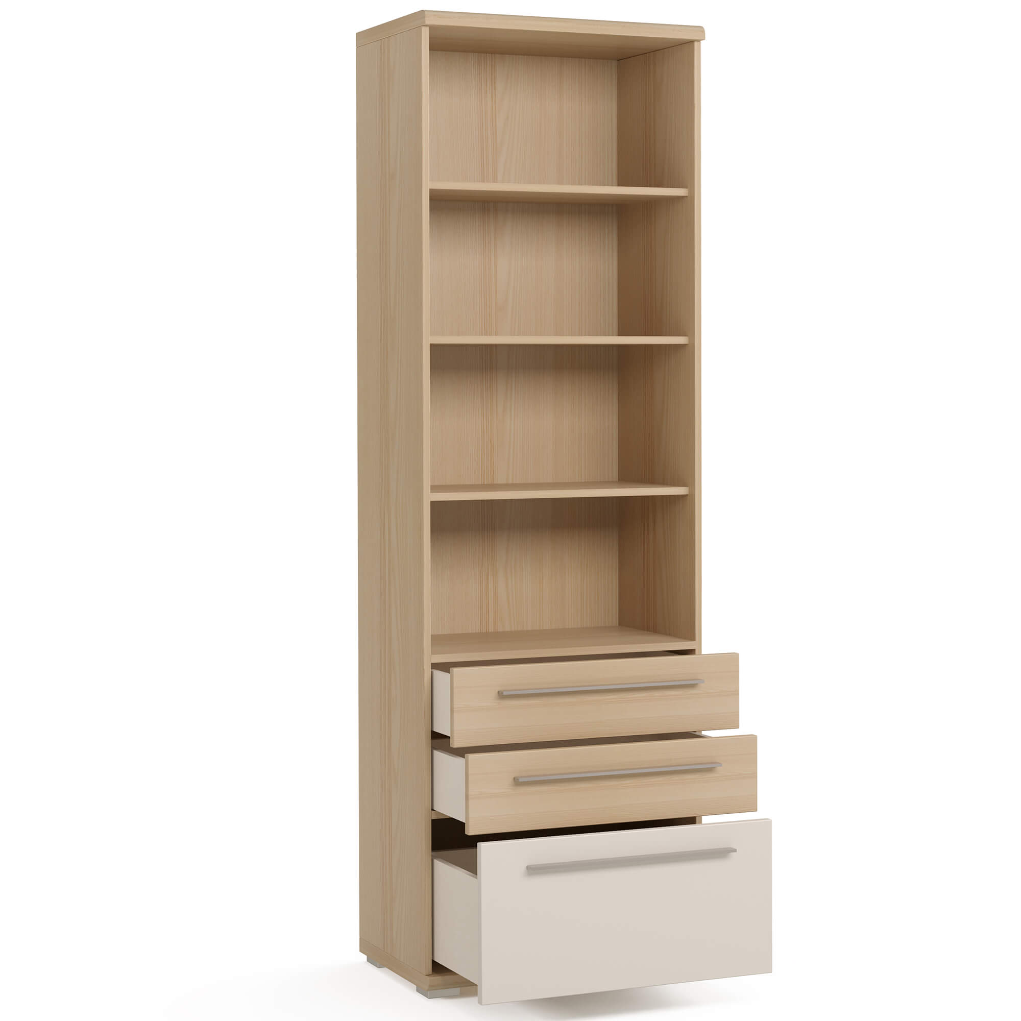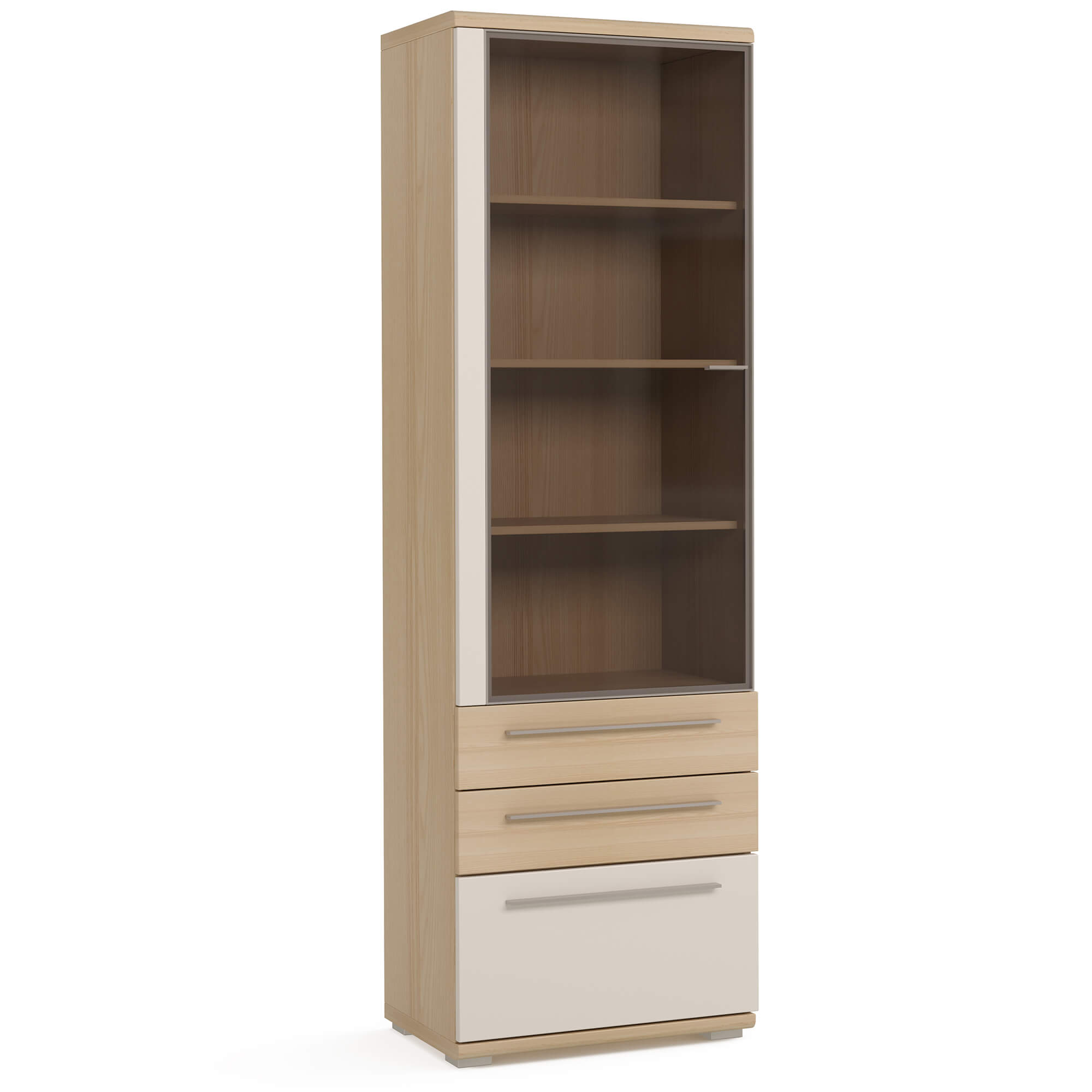 Шкаф-витрина ESTE оснащен распашным фасадом из тонированного стекла, за которым располагаются система полок из ЛДСП. Предусмотрено исполнение как с правым, так и с левым открыванием фасада. В нижней части шкафа располагаются три выдвижных ящика.