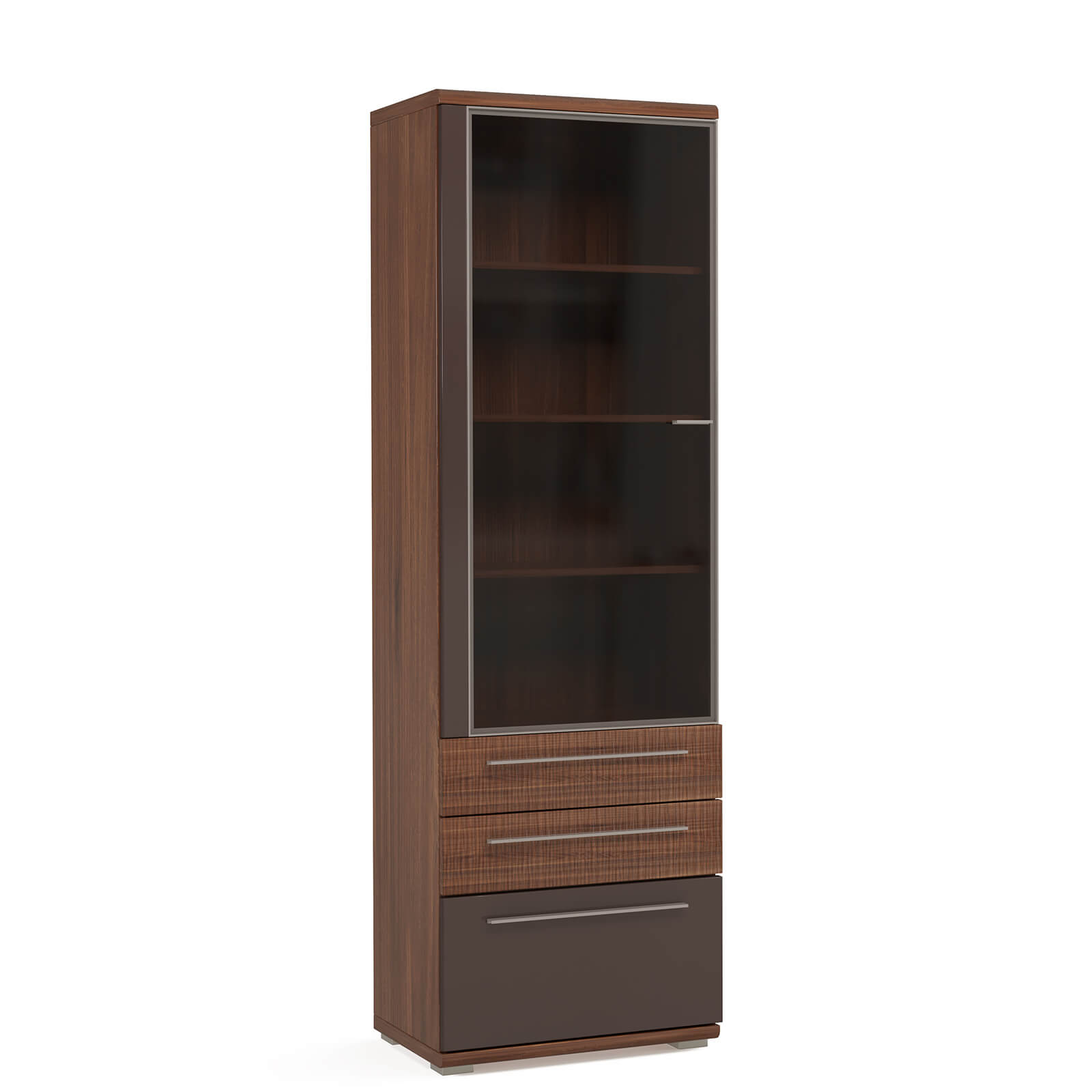 Шкаф-витрина SAVONA оснащен распашным фасадом из тонированного стекла, за которым располагаются система полок из ЛДСП. Предусмотрено исполнение как с правым, так и с левым открыванием фасада. В нижней части шкафа располагаются два выдвижных ящика.