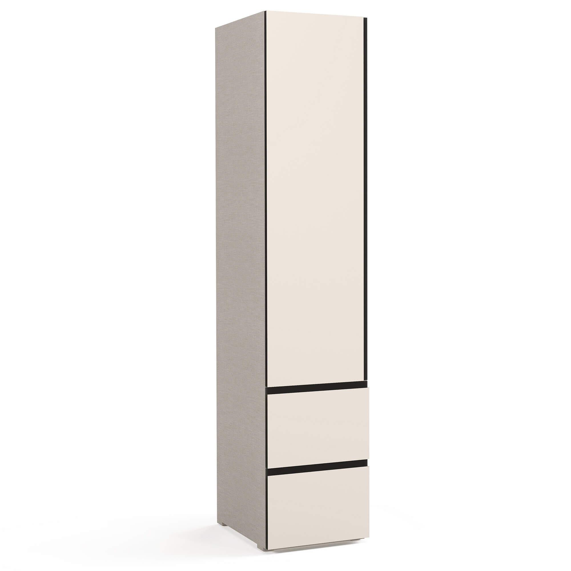 Однодверный шкаф ARTA в отделке Cachmere матовый оснащен распашным фасадом с J-ручкой, за которым находится система полок. Предусмотрено исполнение как с правым, так и с левым открыванием. В нижней части шкафа располагаются два выдвижных ящика. Внешний и внутренний декор корпуса – Шенилл.