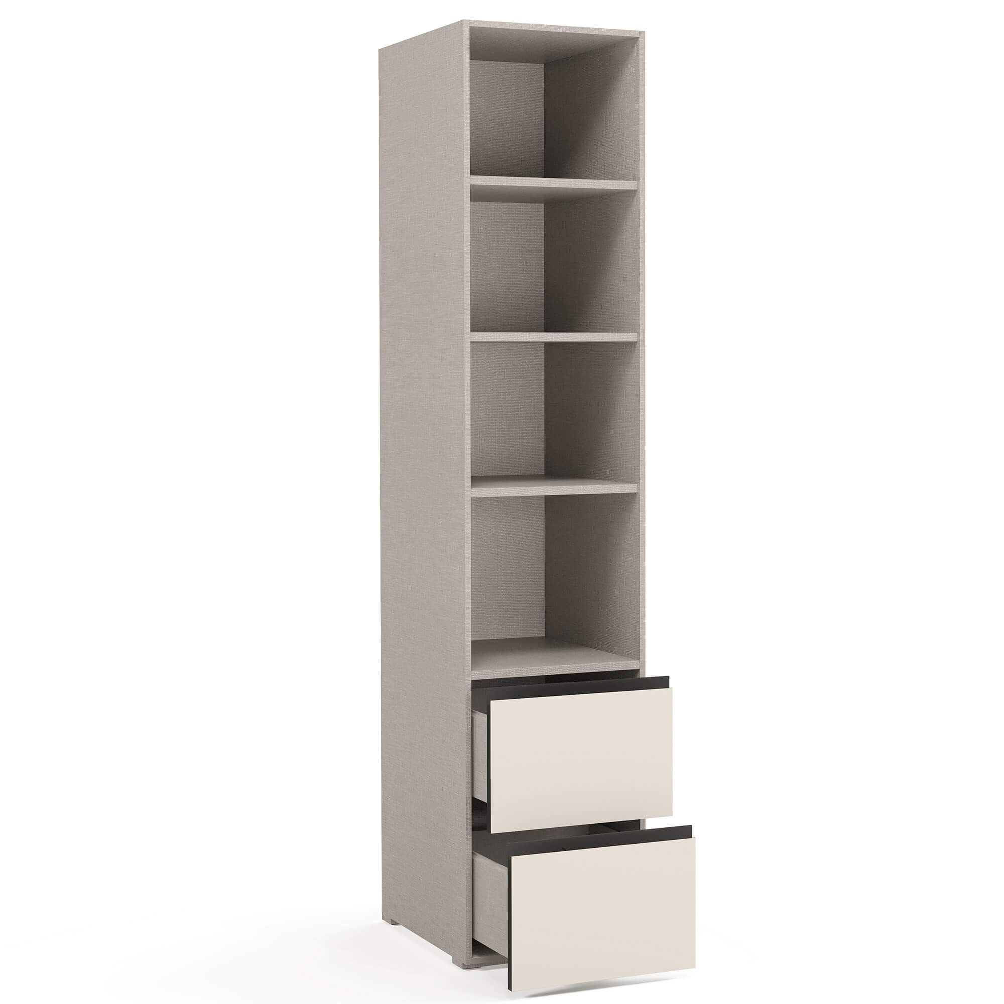 Однодверный шкаф ARTA в отделке Cachmere матовый оснащен распашным фасадом с J-ручкой, за которым находится система полок. Предусмотрено исполнение как с правым, так и с левым открыванием. В нижней части шкафа располагаются два выдвижных ящика. Внешний и внутренний декор корпуса – Шенилл.