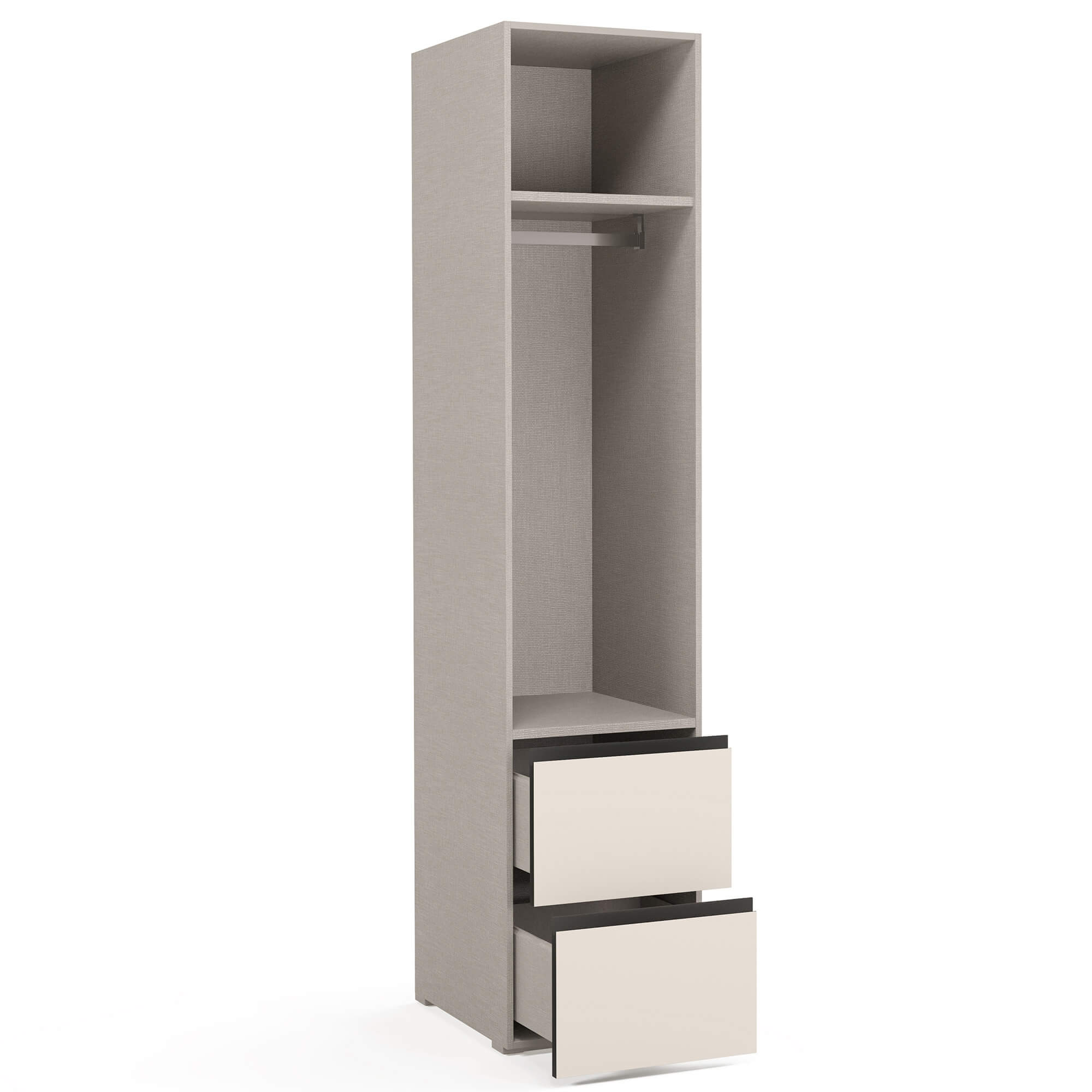 Однодверный шкаф ARTA в отделке Cachmere матовый оснащен распашным фасадом с J-ручкой, за которым находится полка с закрепленной на ней штангой для вешалок. Предусмотрено исполнение как с правым, так и с левым открыванием. В нижней части шкафа располагаются два выдвижных ящика. Внешний и внутренний декор корпуса – Шенилл.