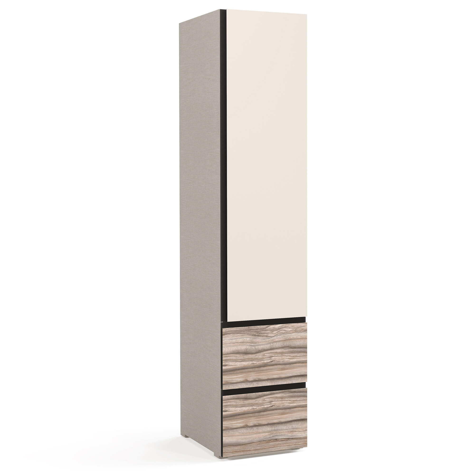 Однодверный шкаф ARTA оснащен распашным фасадом с J-ручкой в отделке Cachmere матовый, за которым находится полка с закрепленной на ней штангой для вешалок. Предусмотрено исполнение как с правым, так и с левым открыванием. В нижней части шкафа располагаются два выдвижных ящика в акцентной текстуре Mramor Medio. Внешний и внутренний декор корпуса – Шенилл.