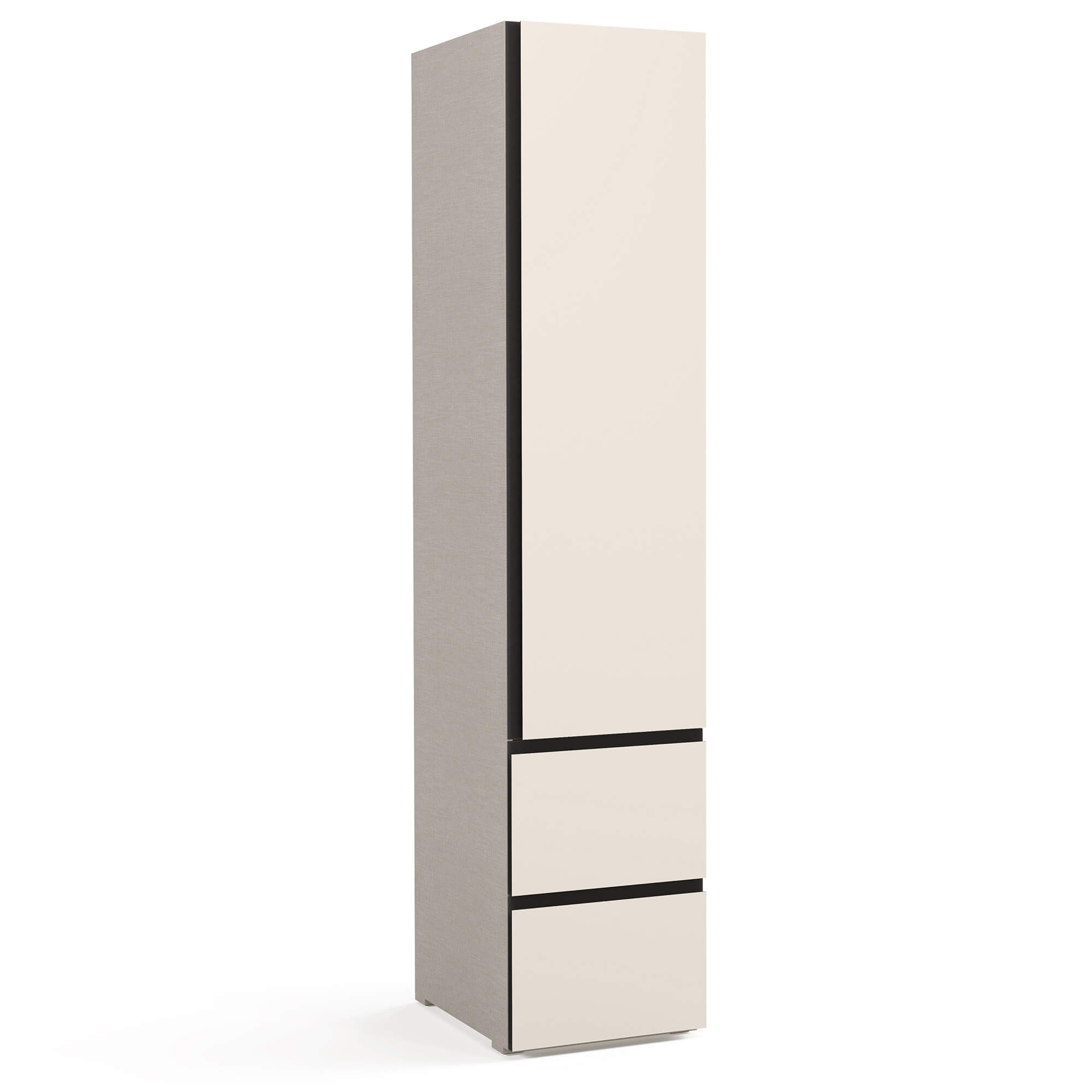 Однодверный шкаф ARTA в отделке Cachmere матовый оснащен распашным фасадом с J-ручкой, за которым находится полка с закрепленной на ней штангой для вешалок. Предусмотрено исполнение как с правым, так и с левым открыванием. В нижней части шкафа располагаются два выдвижных ящика. Внешний и внутренний декор корпуса – Шенилл.