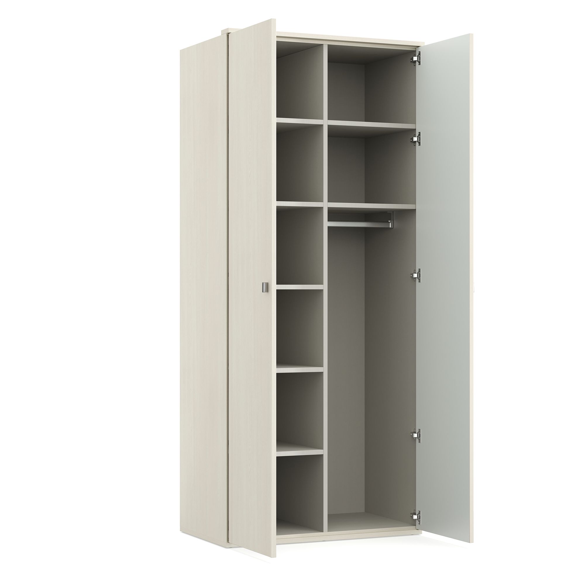 Внутреннее пространство двухдверного шкафа ELEGANTE с распашными фасадами поделено на две секции. Одна из них оснащена двумя полками, к нижней из которых крепится штанга для вешалок. Внутреннее наполнение второй боковой секции представляет собой систему полок. Доводчики для плавного закрывания фасадов входят в базовую комплектацию. Дизайн шкафа предусматривает несколько вариантов ручек на выбор.