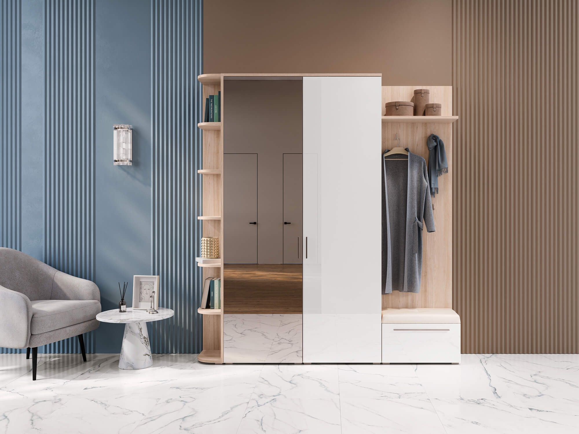 Коллекция включает решения для разных жилых зон. Это позволяет рационально использовать пространство прихожей, комбинируя платяные шкафы различных габаритов. Для объединения элементов глубиной 59,4 и 36 см в композицию используется переходной шкаф со стеллажом.