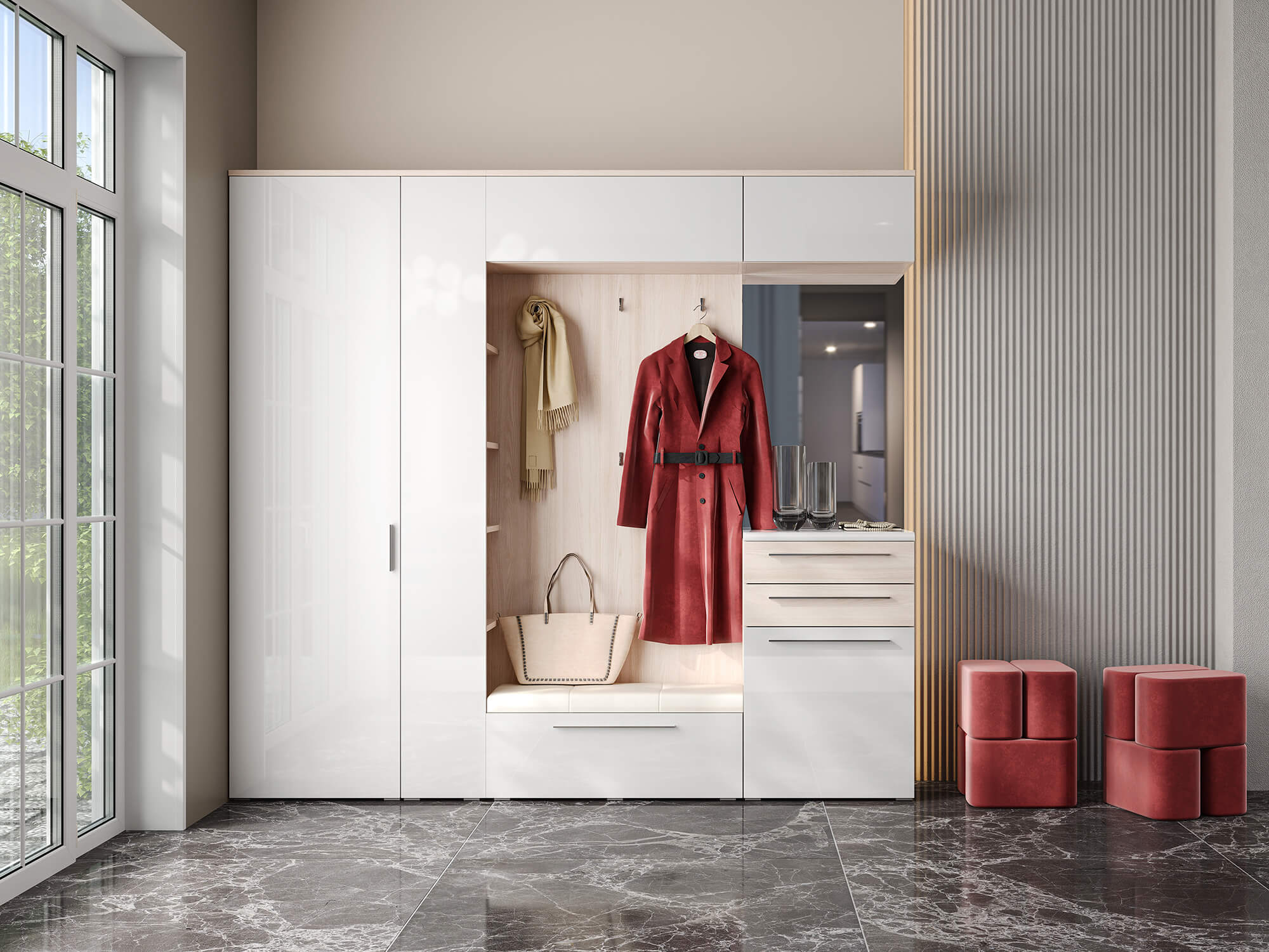 Коллекция включает решения для разных жилых зон. Это позволяет рационально использовать пространство прихожей, комбинируя платяные шкафы различных габаритов. Для объединения элементов глубиной 59,4 и 36 см в композицию используется переходной шкаф со стеллажом.