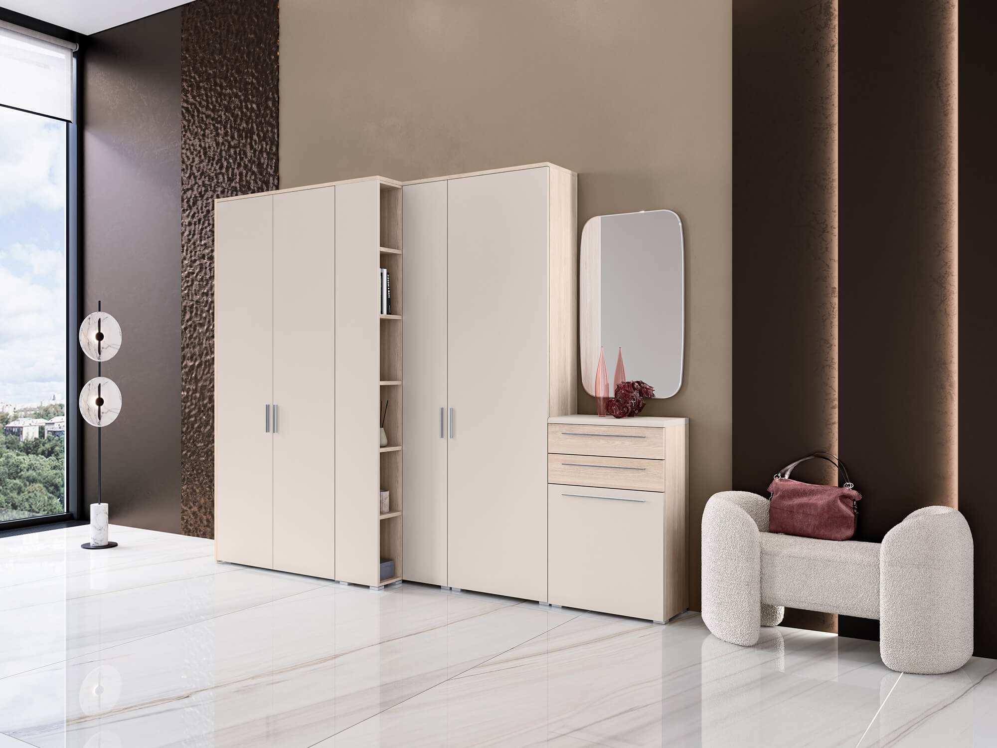 Коллекция включает решения для разных жилых зон. Это позволяет рационально использовать пространство прихожей, комбинируя платяные шкафы различных габаритов. Для объединения элементов глубиной 59,4 и 36 см в композицию используется переходной шкаф со стеллажом.