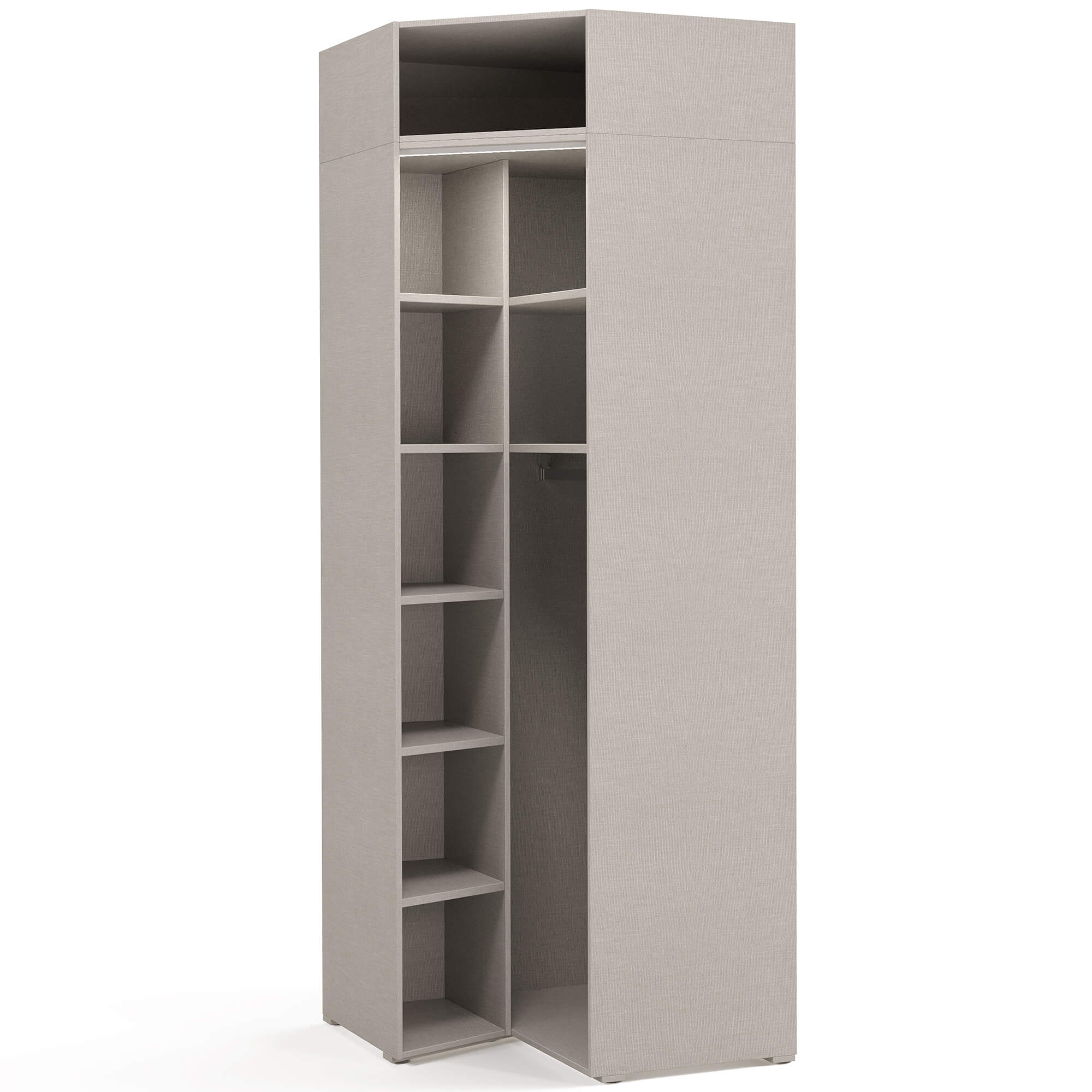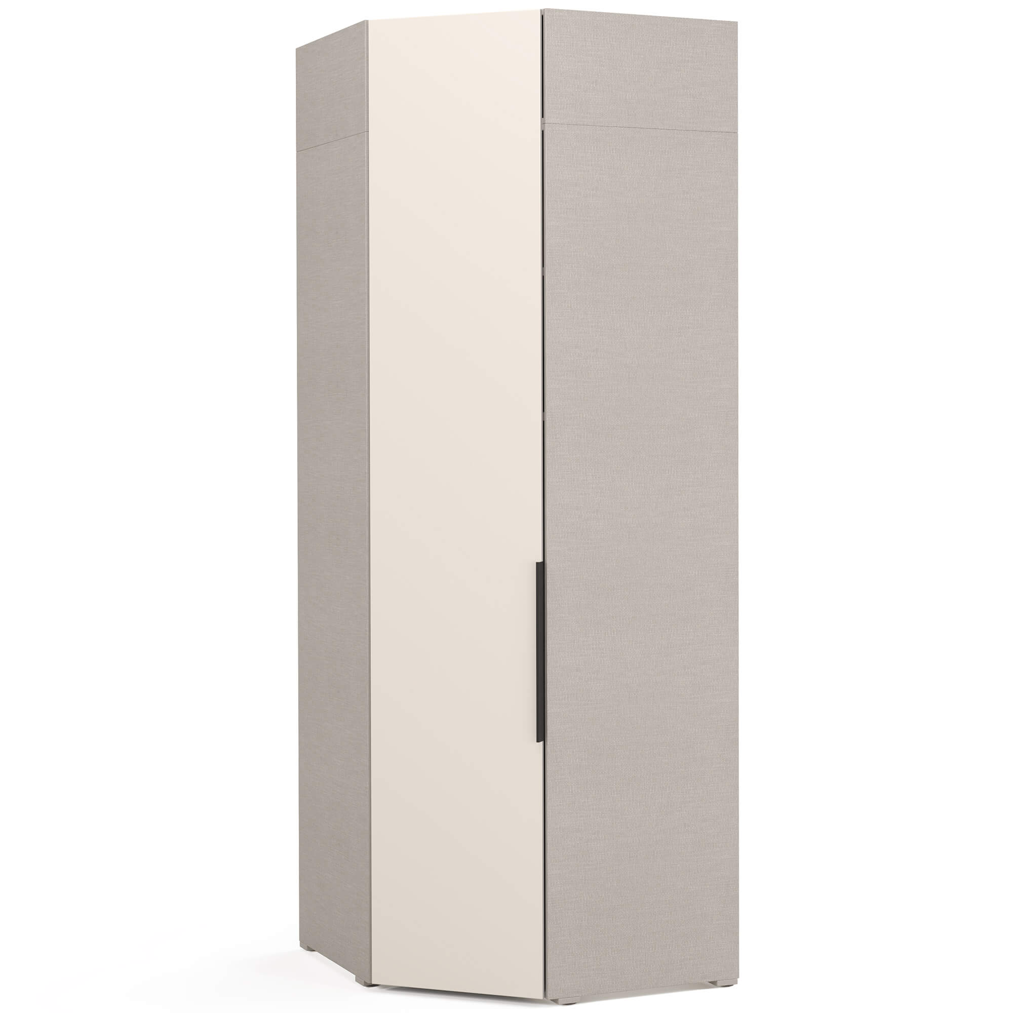Внутреннее пространство углового шкафа АРТА / ARTA с антресолью поделено на две секции. В одной из них располагается система полок, в другой – две полки, к нижней из которых крепится штанга для вешалок. Модель оснащена распашным фасадом в отделке Cachmere матовый. Возможно как левое, так и правое открывание. Внутреннее пространство шкафа выполнено в отделке текстурой Шенилл. Встроенная подсветка включается автоматически при открывании фасада. Система включения с трансформатором заказывается отдельно.