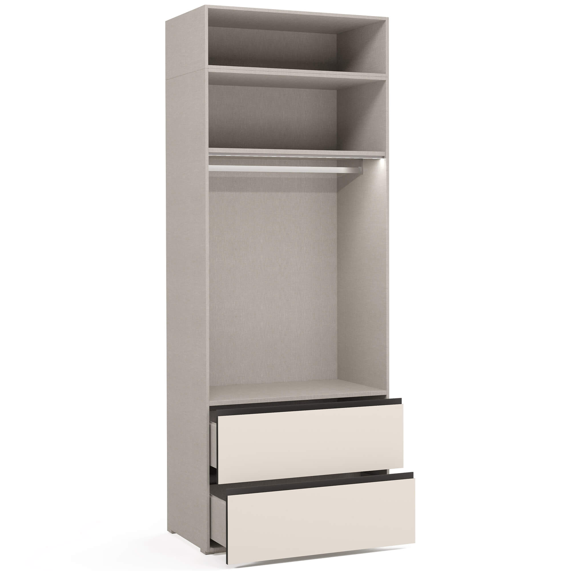 В верхней части двухдверного шкафа АРТА / ARTA с антресолью располагается полка, к которой крепится штанга для вешалок. В нижней – выдвижные ящики. Фасады модели выполнены в отделке Cachmere матовый. Внутреннее пространство шкафа выполнено в отделке текстурой Шенилл.
