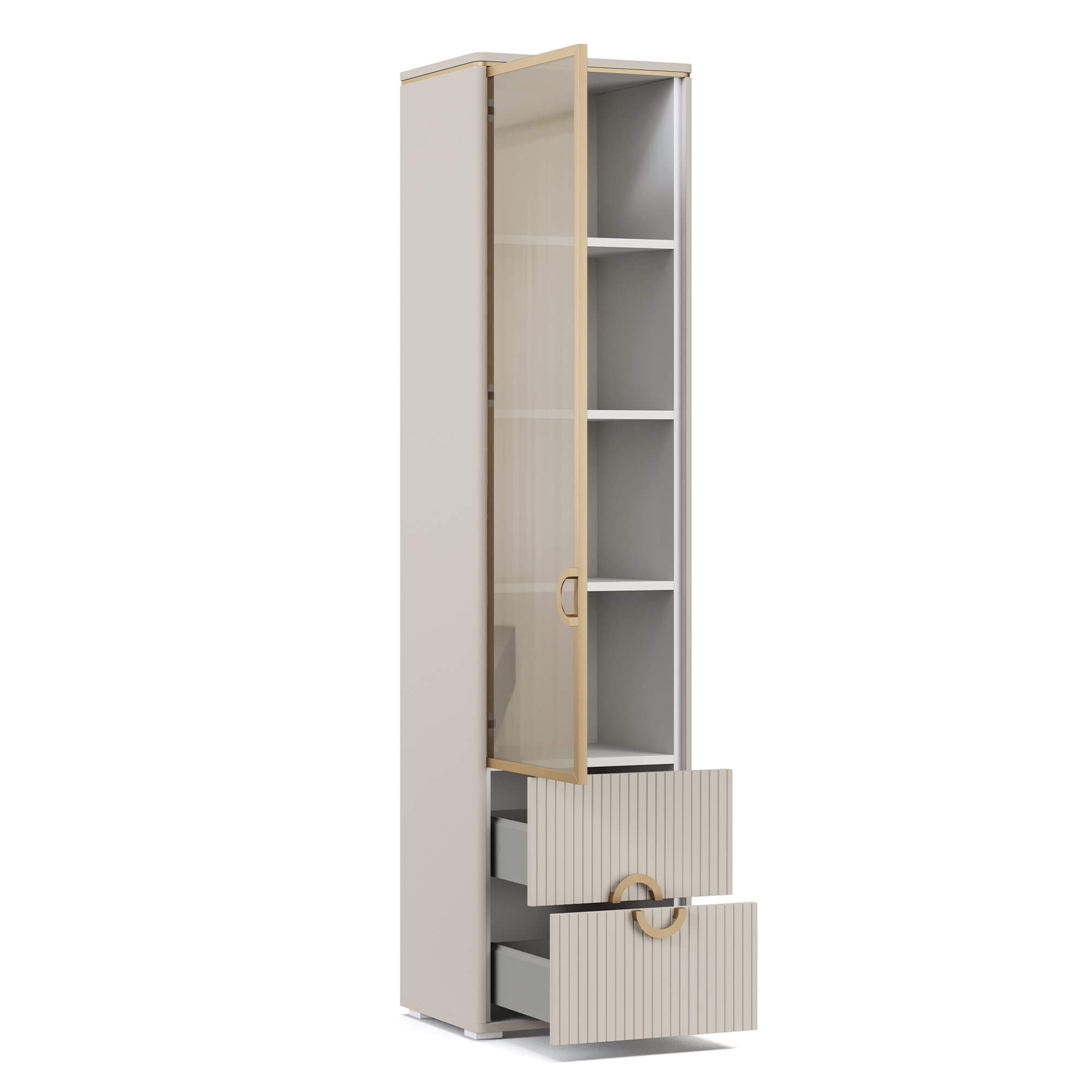 Распашной фасад напольного шкафа-витрины ТИАРА / TIARA выполнен из тонированного стекла бронзового оттенка с зеркальным эффектом. За стеклом, заключенным в металлическую раму с покрытием Матовое золото, расположена система полок из ЛДСП. В нижней части шкафа располагаются выдвижные ящики с внутренней текстурой Шенилл, повторяющей рисунок натуральной ткани. Фасады модели выполнены в отделке эмалью и декорированы вертикальной фрезеровкой и оснащены ручками в отделке Матовое золото.
