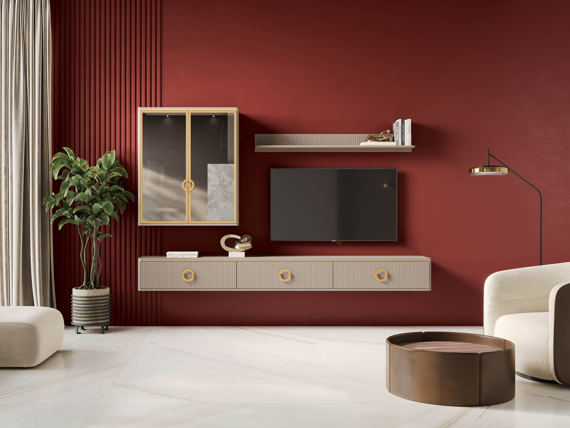 Изящное обрамление стеклянных фасадов придает мебели элегантный вид. Отделка рамок «рифмуется» с другими элементами в оттенке матового золота, создавая стильный и сбалансированный дизайн. Высококачественные материалы обеспечивают их долговечность и прочность.