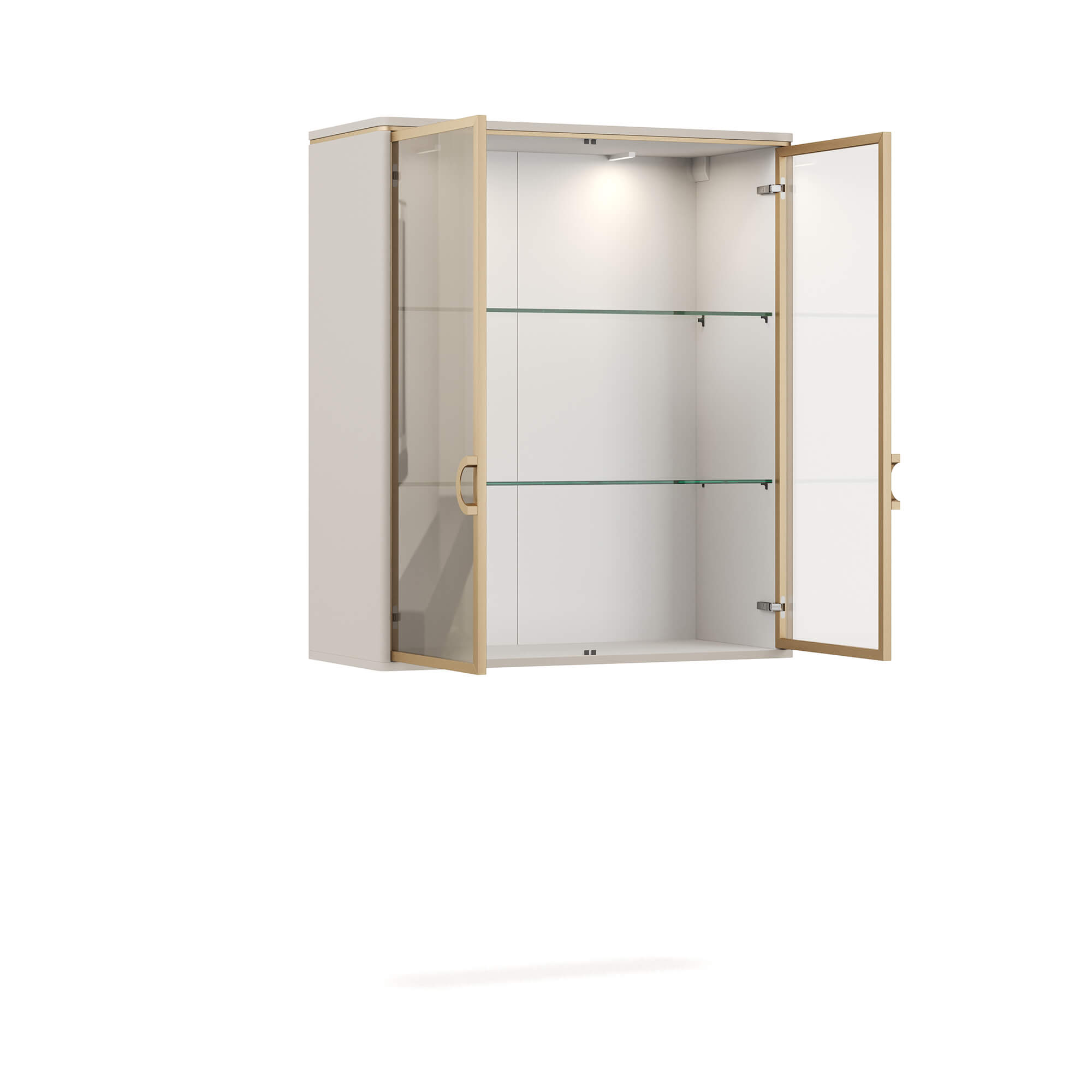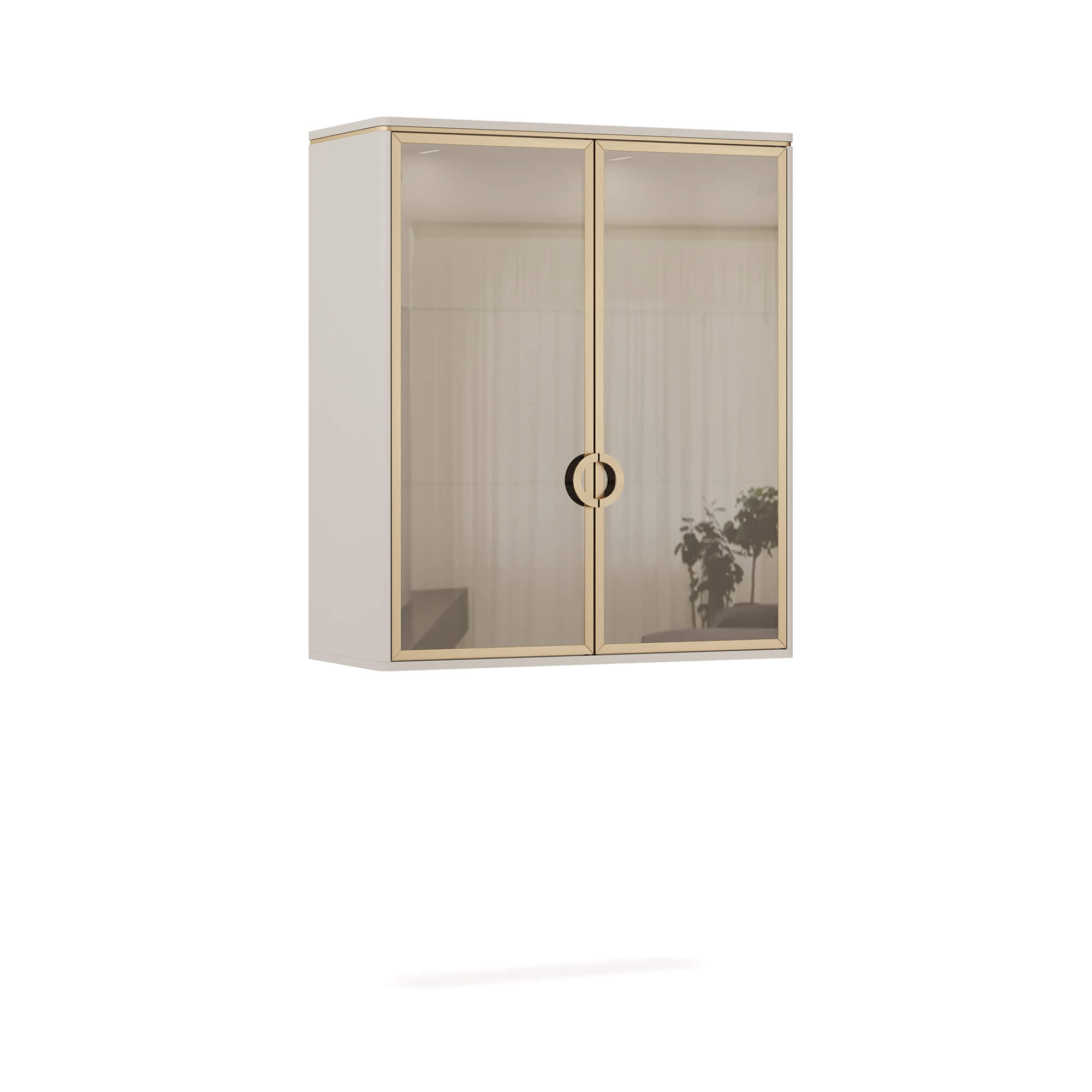 Распашные фасады двухдверного навесного шкафа ТИАРА / TIARA выполнены из тонированного стекла бронзового оттенка с зеркальным эффектом. За стеклами, заключенными в металлическую раму с покрытием Матовое золото, расположена система стеклянных полок. Максимально допустимая распределенная нагрузка – 20 кг.