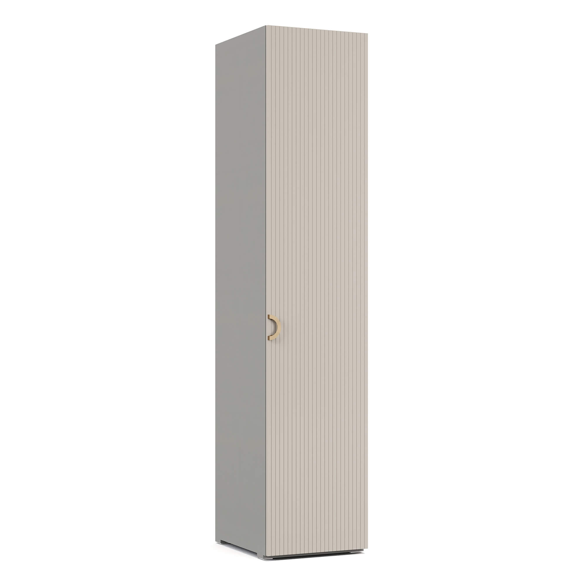 Внутреннее пространство однодверного платяного шкафа ТИАРА / TIARA представляет собой систему полок. Внешний и внутренний декор корпуса выполнен в текстуре Шенилл, повторяющей рисунок натуральной ткани. Фасад модели выполнен в отделке эмалью, декорирован вертикальной фрезеровкой и оснащен ручкой в отделке Матовое золото. Возможно как правое, так и левое открывание. Глубина шкафа указана с учетом фасада.
