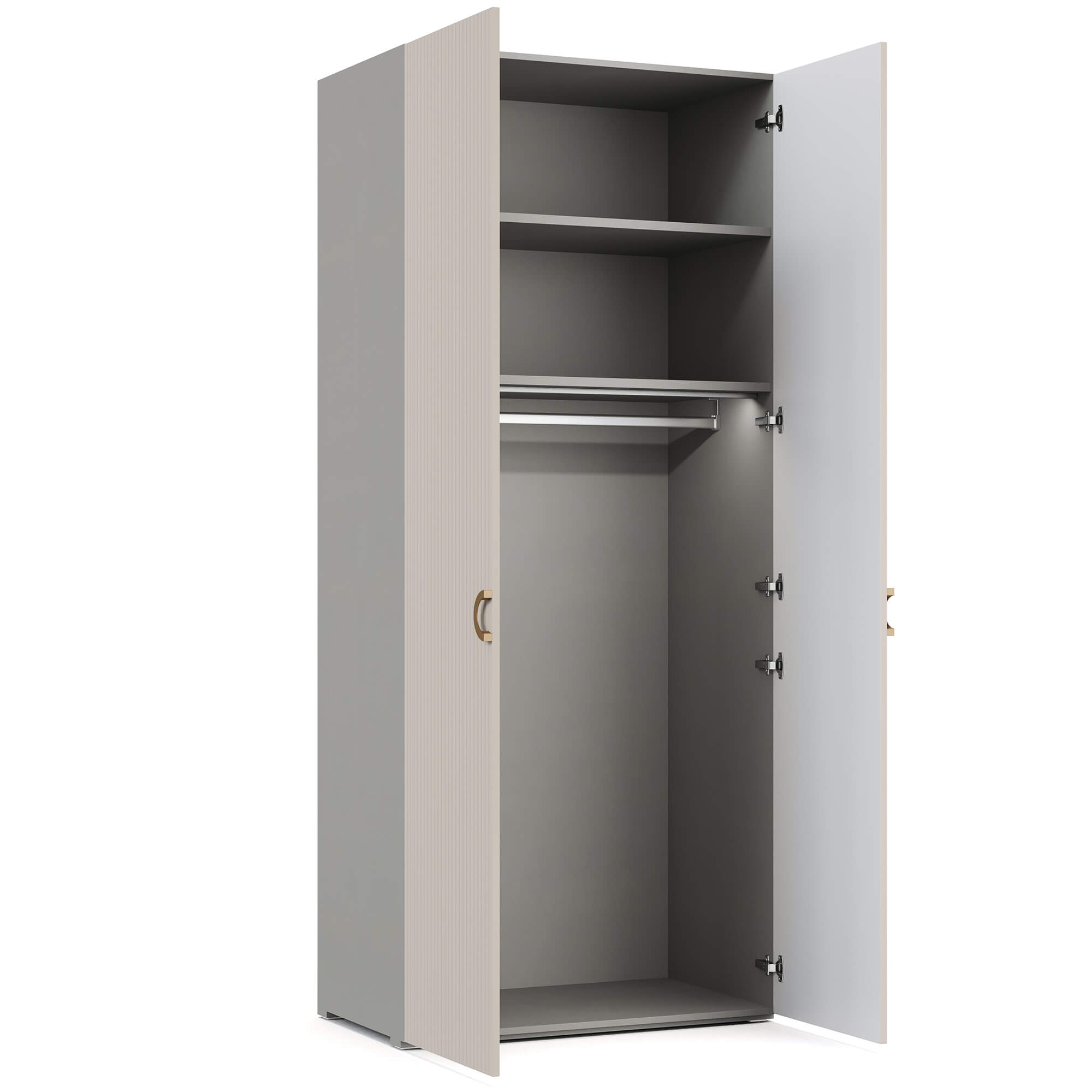 В верхней части двухдверного платяного шкафа ТИАРА / TIARA расположены две полки, к нижней из которых крепится штанга для вешалок. Внешний и внутренний декор корпуса выполнен в текстуре Шенилл, повторяющей рисунок натуральной ткани. Фасады модели выполнены в отделке эмалью, декорированы вертикальной фрезеровкой и оснащены ручками в отделке Матовое золото. Глубина шкафа указана с учетом фасадов. Шкаф оснащен системой внутренней подсветки в базовой комплектации. Система включения заказывается отдельно.
