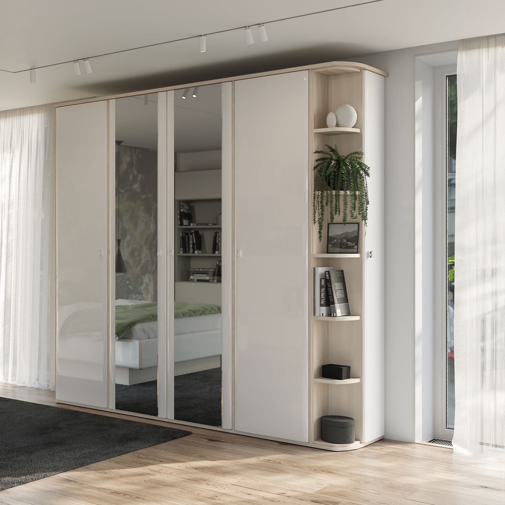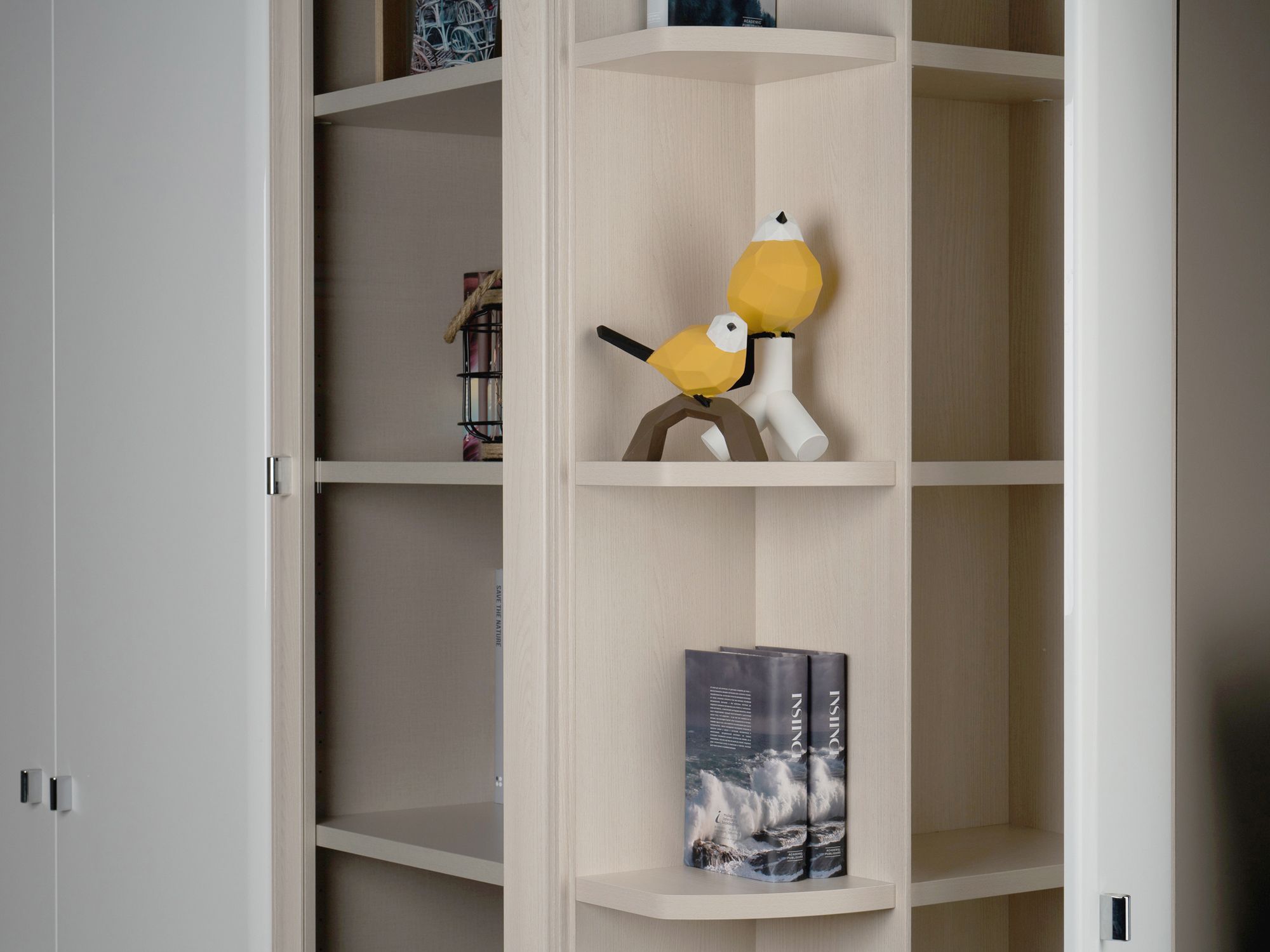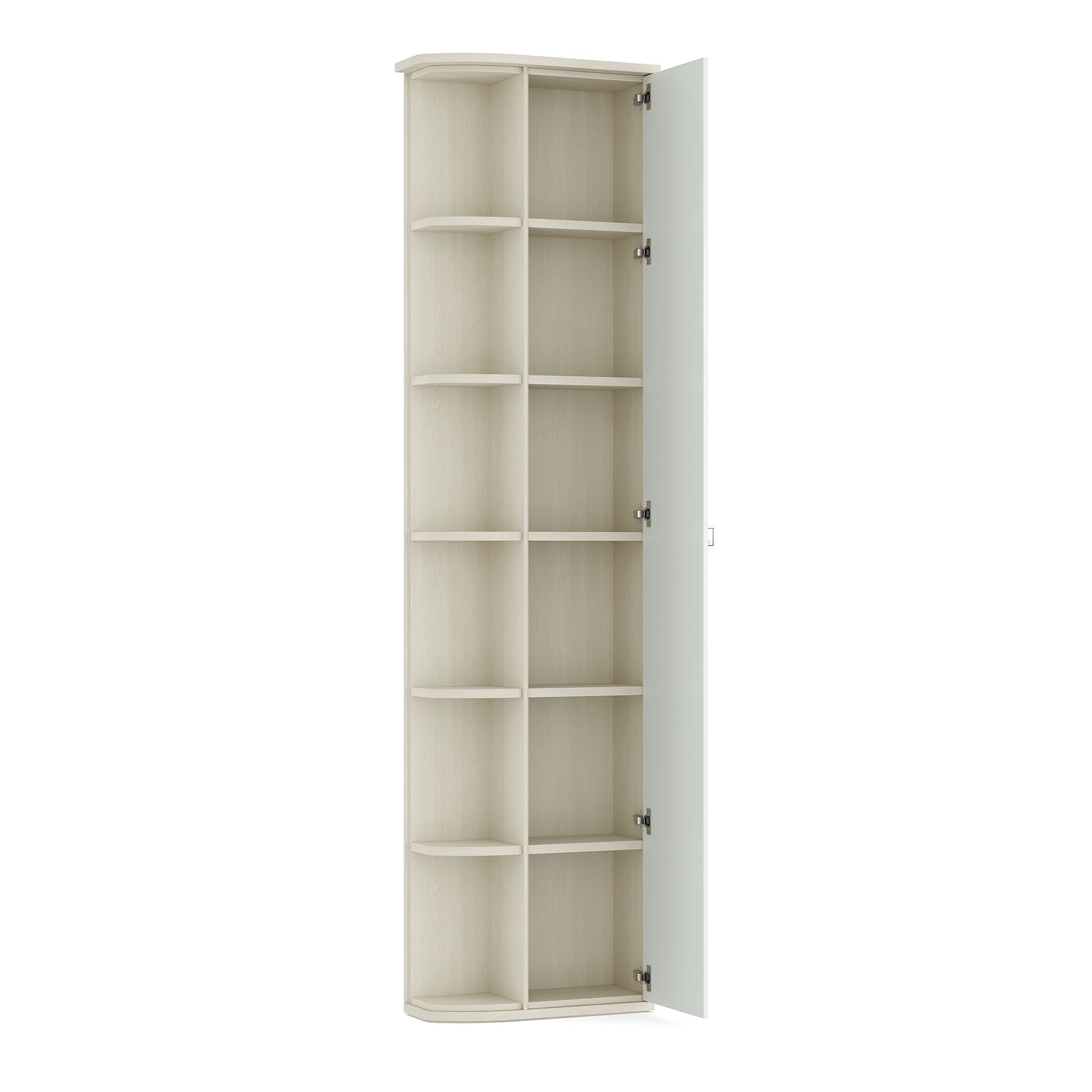 Завершающий шкаф ELEGANTE, объединяющий функции закрытого и открытого хранения, может располагаться как в левой, так и в правой части шкафной композиции. За распашным фасадом расположена система полок. Доводчики для плавного открывания и закрывания включены в комплектацию модели. Дизайн шкафа предусматривает несколько вариантов ручек на выбор.
