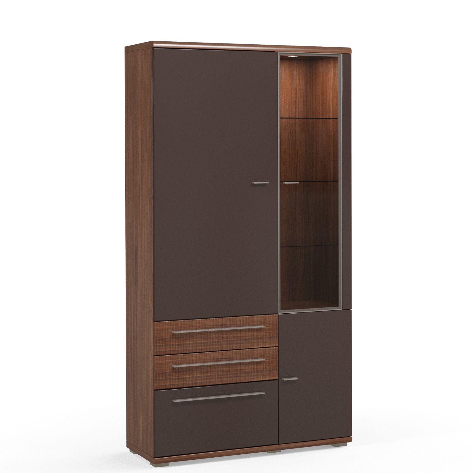 Шкаф-витрина SAVONA оснащен распашными фасадами, а также выдвижными ящиками, декорированными эксклюзивным тиснением. Секция за фасадом из тонированного стекла оборудована стеклянными полками и встроенным светильником. Системы плавного открывания дверей входят в базовую комплектацию.