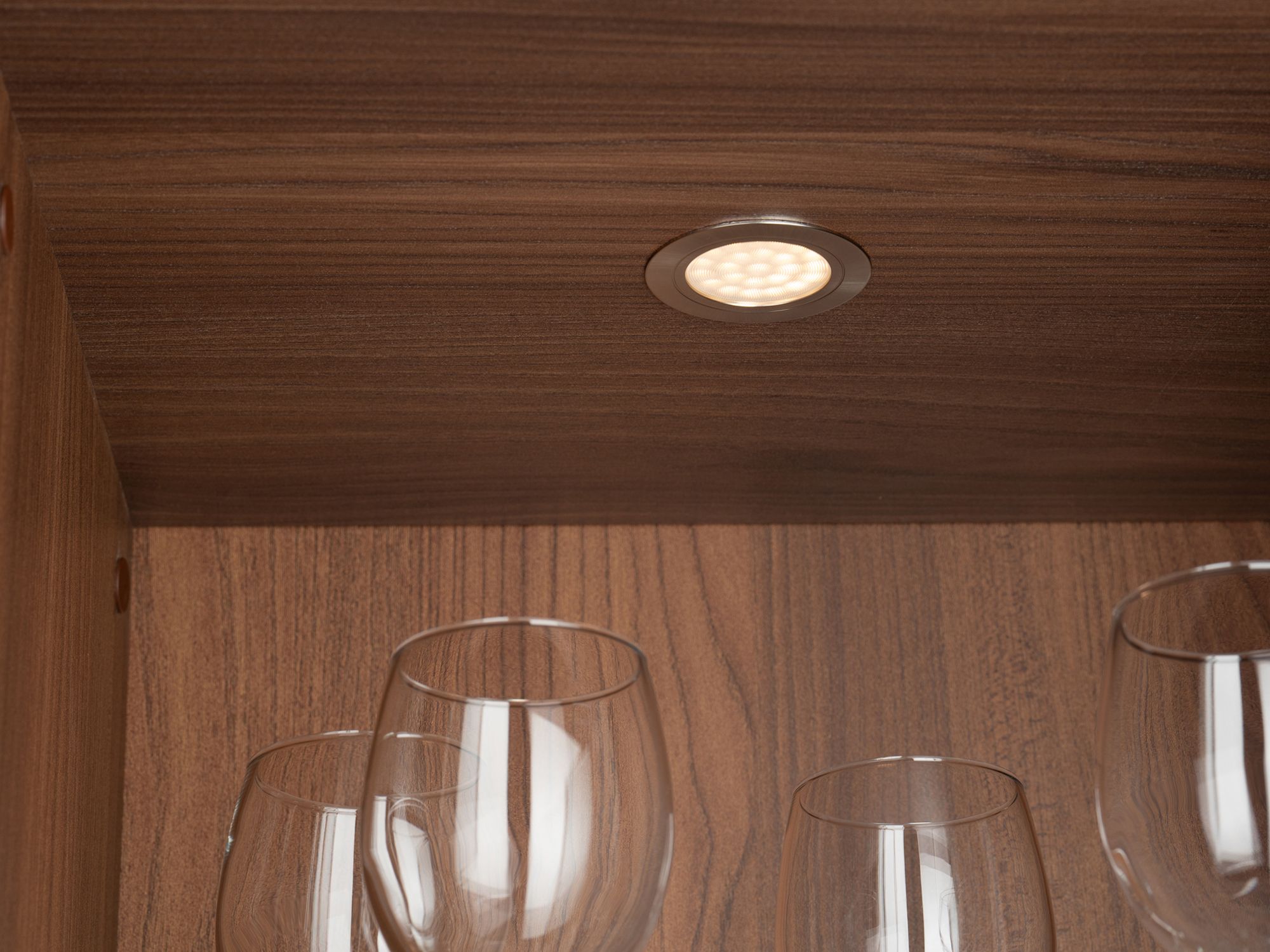 Дизайнерская подсветка шкафов-витрин на основе европейской световой системы придает композиции глубину и создает уютный вечерний сценарий освещения.