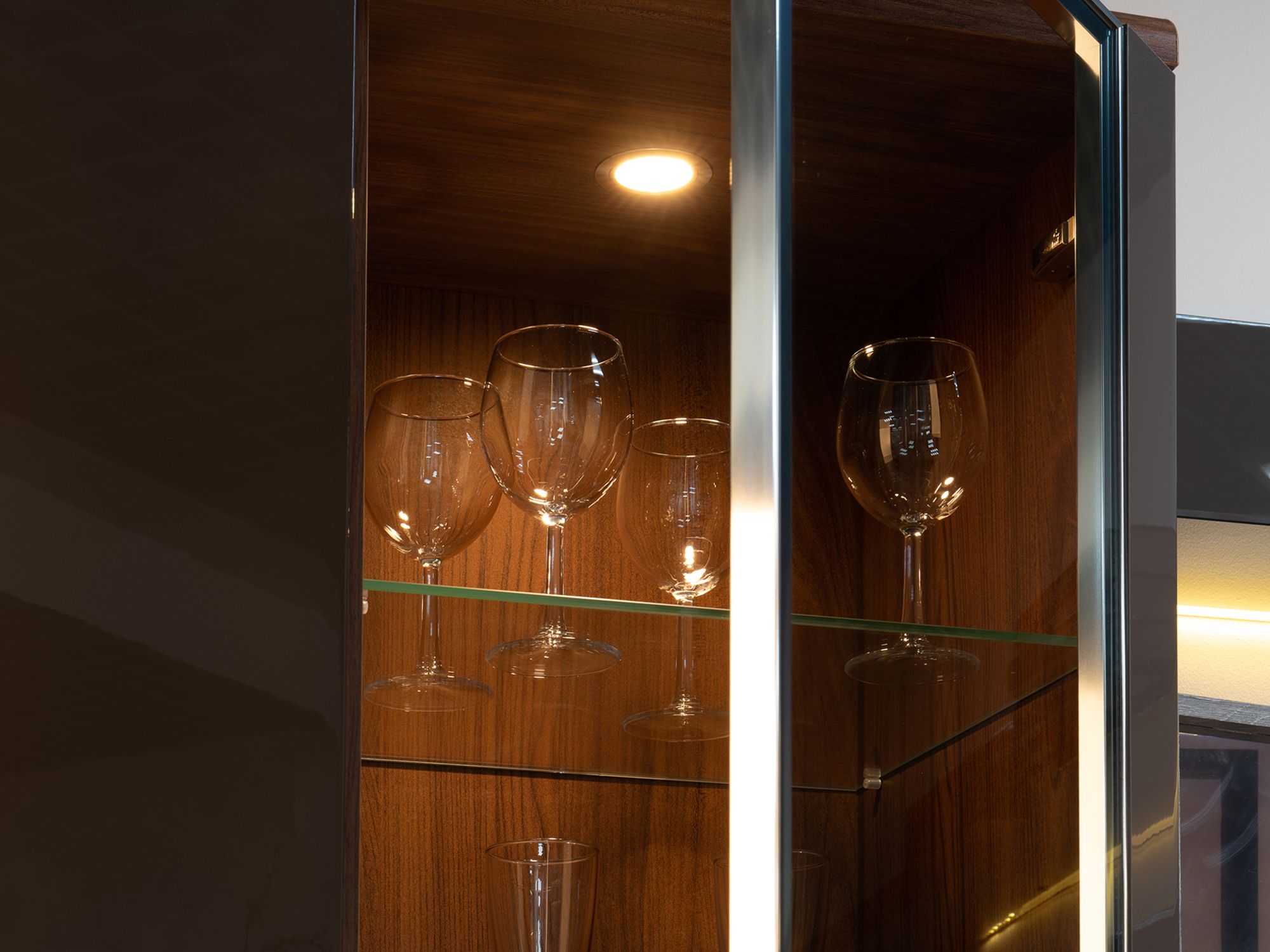 Дизайнерская подсветка шкафов-витрин на основе европейской световой системы придает композиции глубину и создает уютный вечерний сценарий освещения.