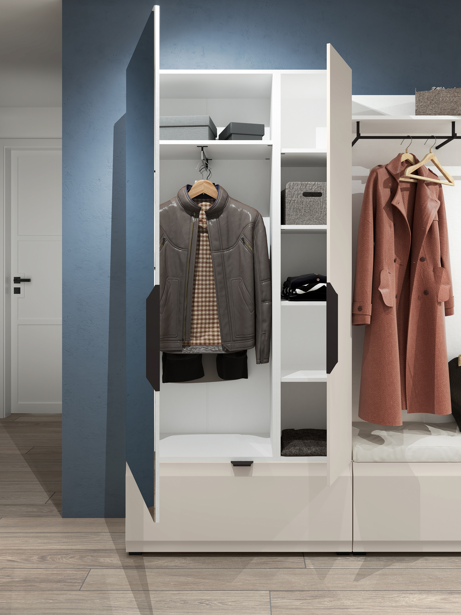 Коллекция предусматривает возможность создания индивидуальной системы хранения с помощью перемещения полок на удобную высоту с шагом 32 мм и заказа дополнительных вставных тумб с ящиками.