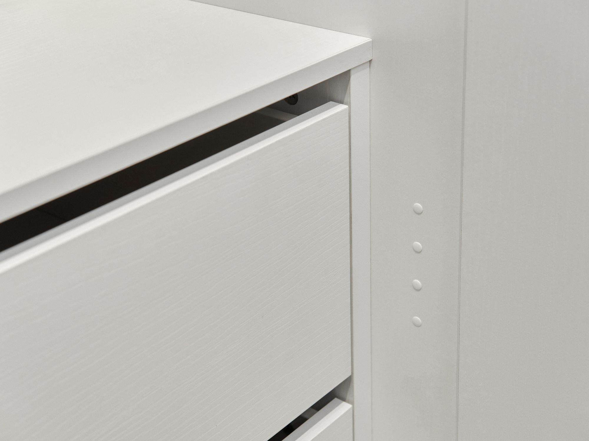 Опоры с регулировкой высоты в диапазоне до 10 мм позволяют выставить шкафы и тумбы идеально ровно. Возможность регулирования задних опор изнутри платяного шкафа обеспечивает точность сборки мебели и удобство регулировки, тем самым продлевая срок ее службы.
