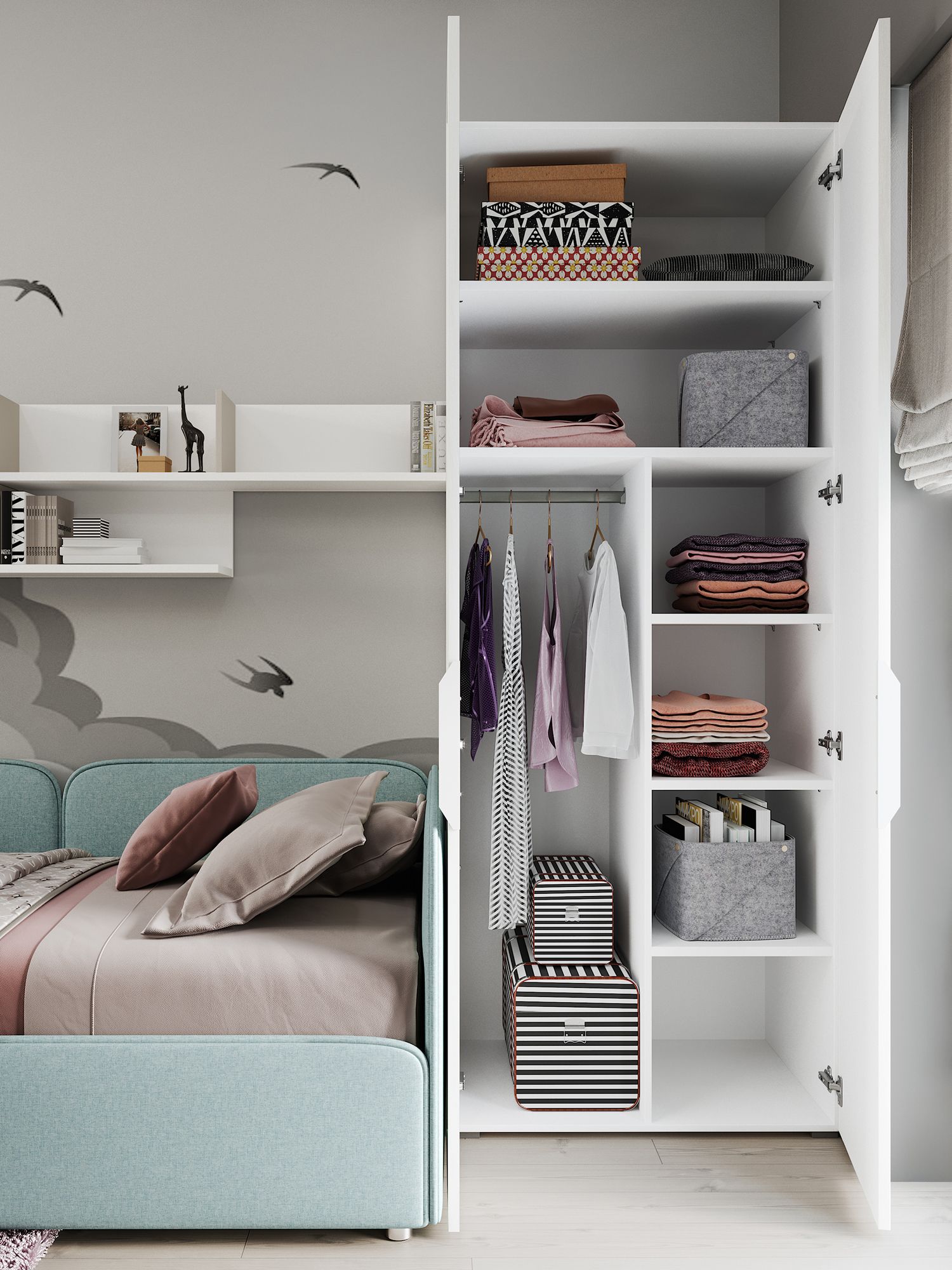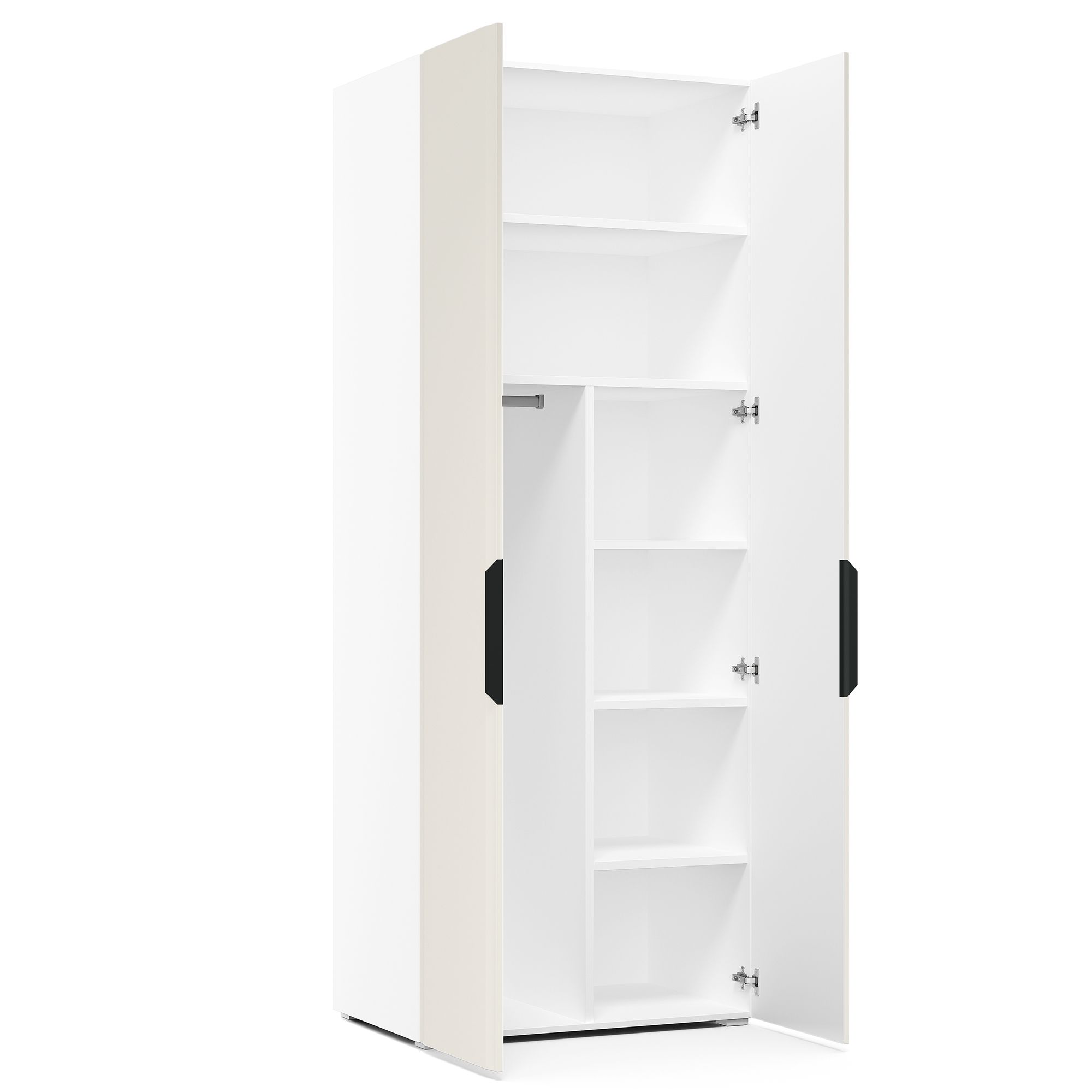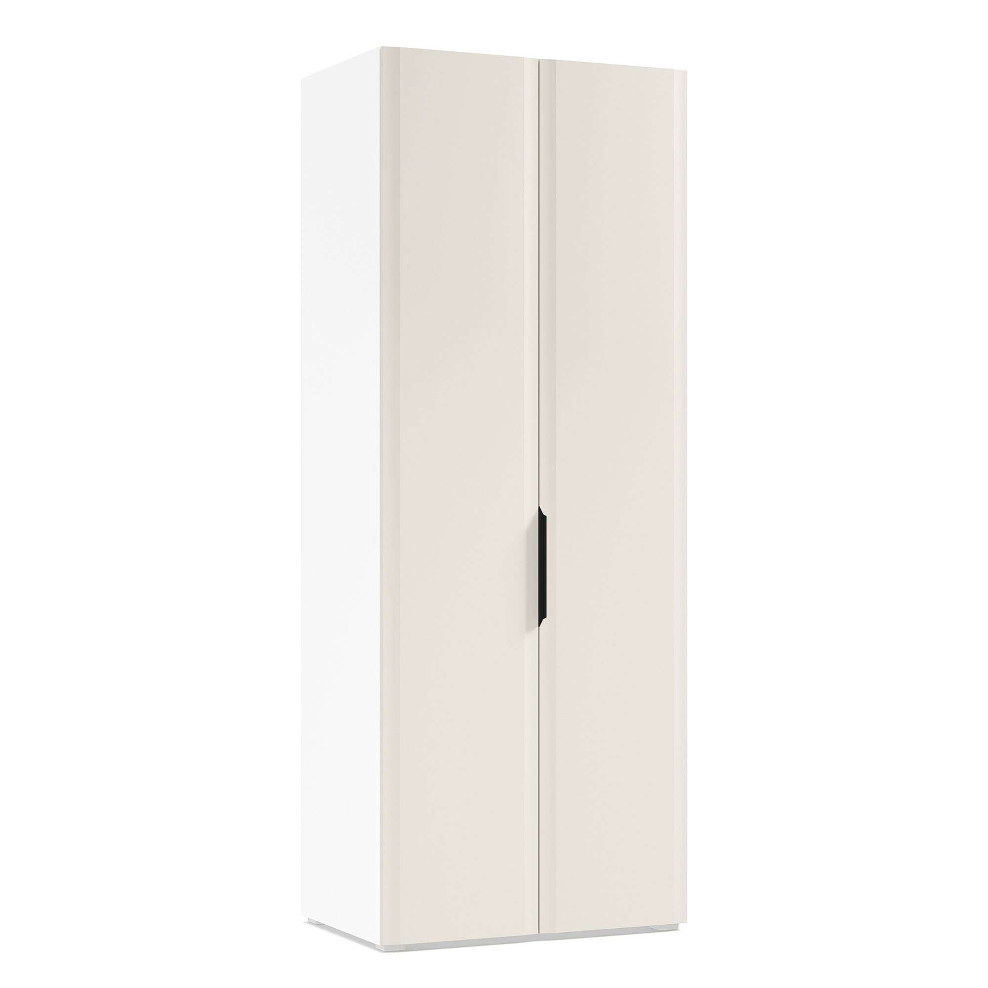 Верхняя часть двухдверного шкафа TURIN с фасадами в отделке тактильной шелковой эмалью занята полками. В нижней располагаются штанга для вешалок (крепится снизу к полке) и система полок из ДСП. Ножки входят в комплектацию. Возможно оснащение шкафа системой подсветки,которая включается автоматически при открывании (заказывается отдельно). ВАЖНО: Коллекция предусматривает индивидуальный выбор ручек мебели,благодаря чему можно придать интерьеру стилистический акцент. Они не входят в комплектацию модели и заказываются отдельно.
