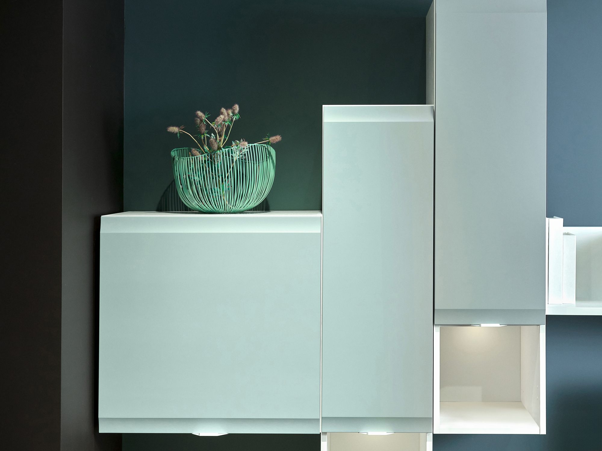 Дизайн коллекции позволяет комбинировать навесные элементы с открытыми полками, создавая легкие и очень современные парящие композиции, наполняющие пространство динамикой.