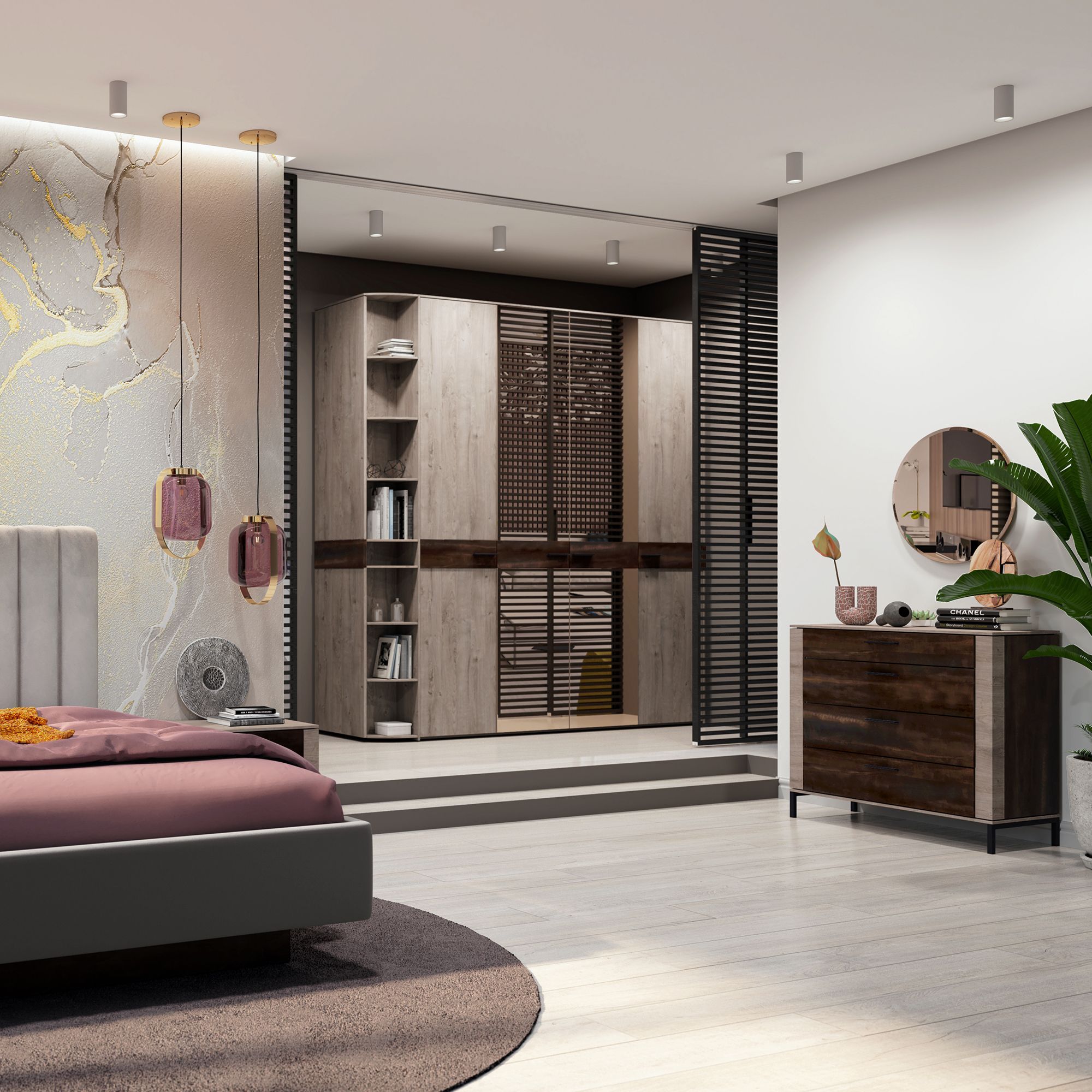 Зрительно и на ощупь трендовая текстура напоминает природный камень или поверхность темного металла с характерным рельефом. Особенным украшением коллекции служат элементы с текстурой Galaxy в отделке прозрачным лаком, которая раскрывает глубину рисунка, открывая взгляду переливы золотых вкраплений.