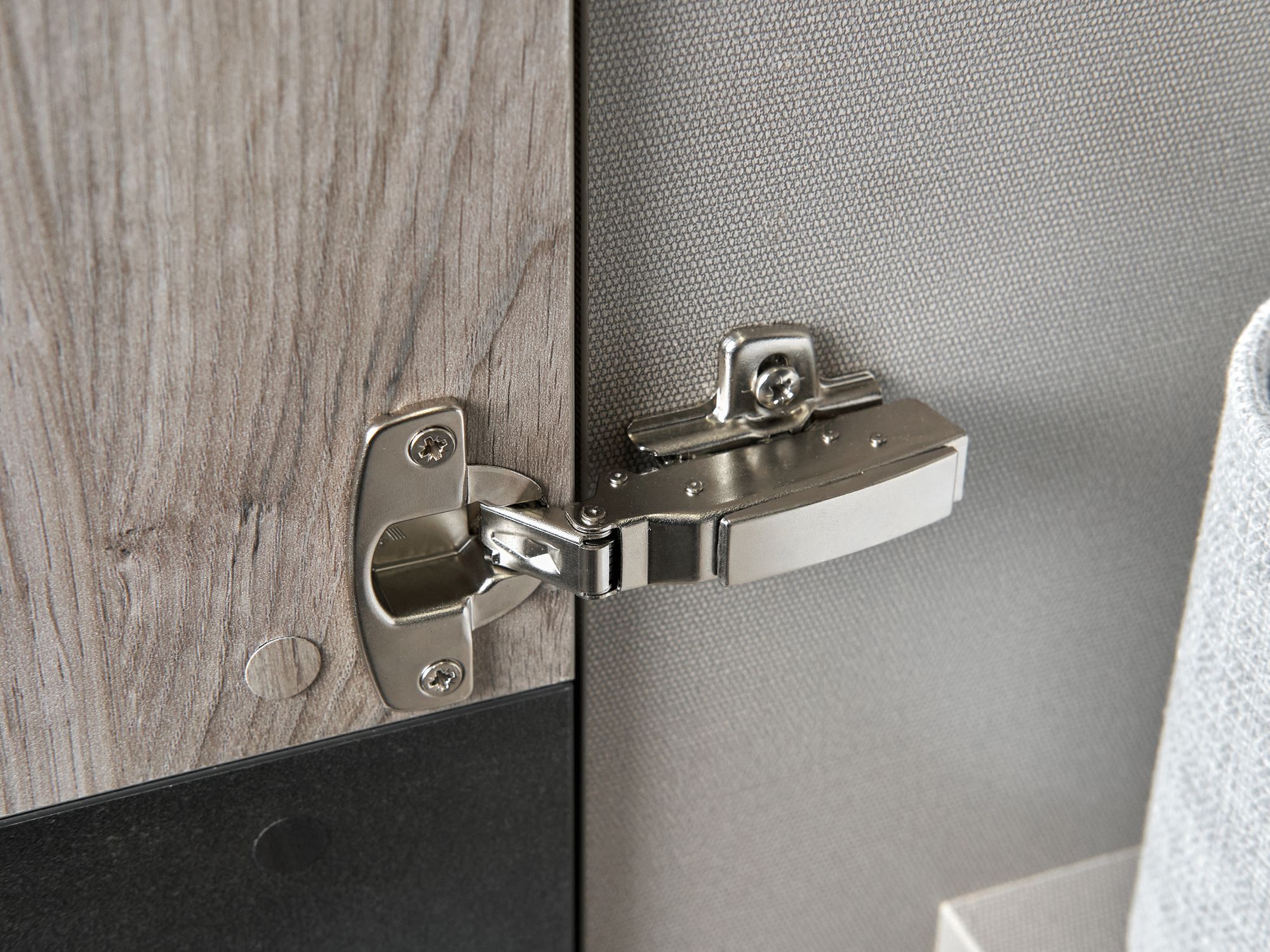 Плавность и бесшумность закрывания фасадов обеспечивают надежные петли с доводчиком. Они рассчитаны на ежедневное активное использование на протяжении всего срока службы мебели.