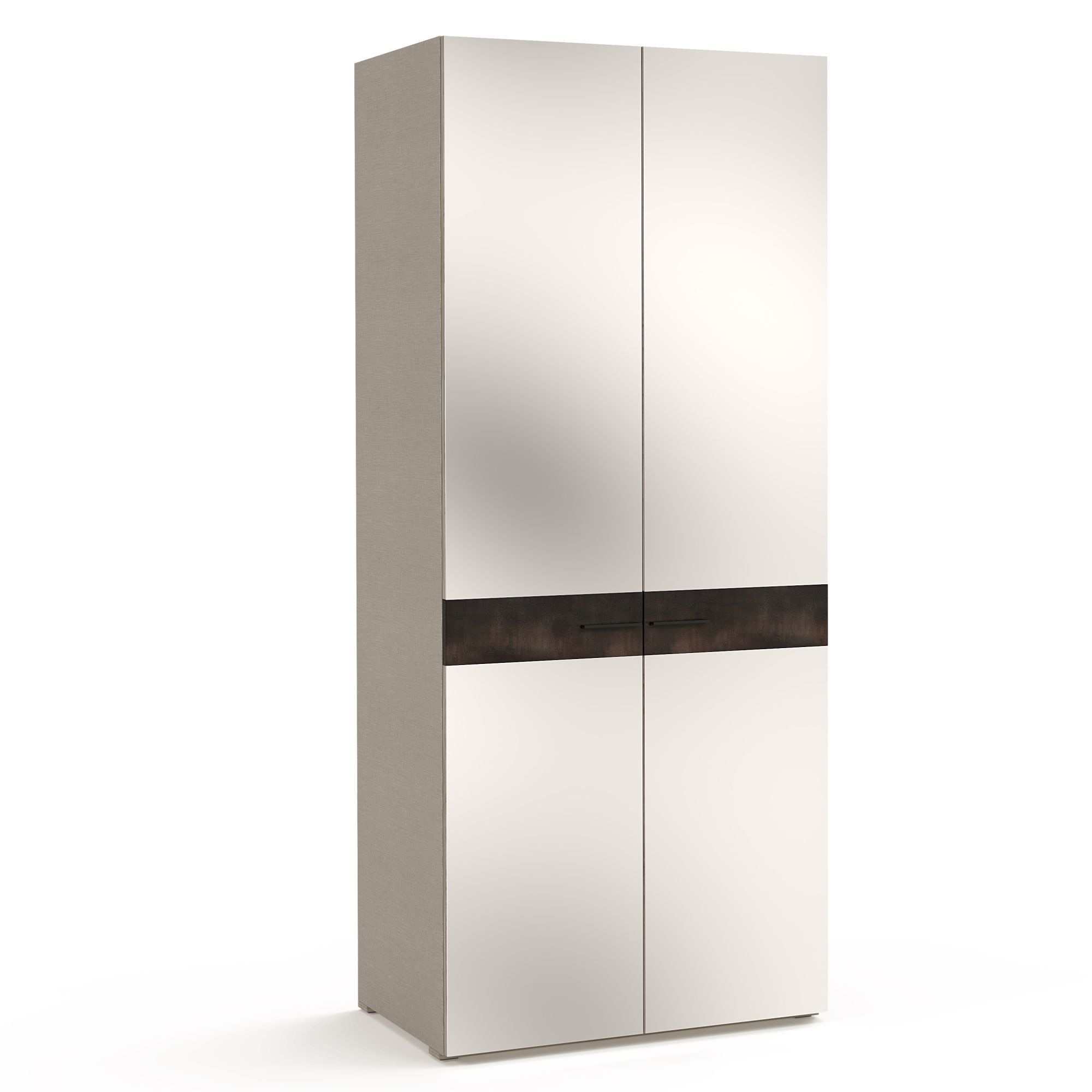 Зеркальные фасады двухдверного шкафа BOSTON декорированы контрастной вставкой. Корпус выполнен в текстуре Шенилл, имитирующей натуральную ткань. Внутреннее наполнение представляет собой две полки, дополнительно доступен заказ вставной тумбы с ящиками. Шкаф оснащен внутренним светильником, срабатывающим при открывании (система включения подсветки с трансформатором и удлинитель заказываются отдельно).