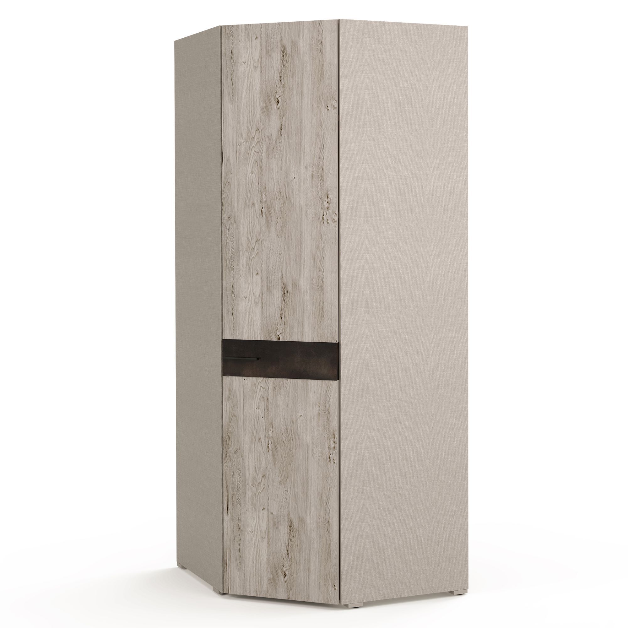 Фасады углового шкафа BOSTON декорированы контрастной вставкой. Корпус выполнен в текстуре Шенилл, имитирующей натуральную ткань. Внутреннее наполнение представляет собой систему полок, а также отделение для вешалок с двумя полками и штангой. Шкаф оснащен внутренним светильником, срабатывающим при открывании (система включения подсветки с трансформатором и удлинитель заказываются отдельно).