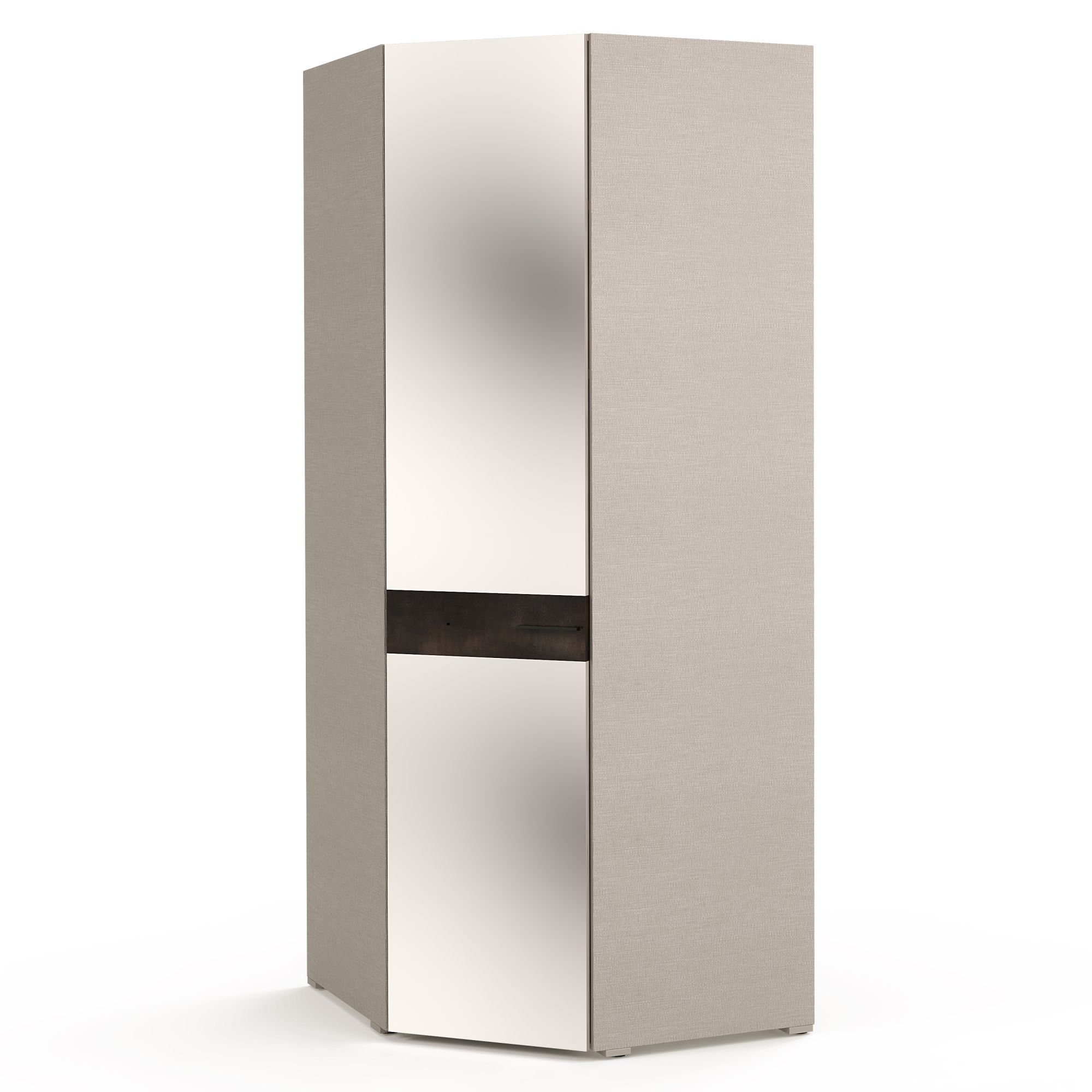 Зеркальные фасады углового шкафа BOSTON декорированы контрастной вставкой. Корпус выполнен в текстуре Шенилл, имитирующей натуральную ткань. Внутреннее наполнение представляет собой систему полок, а также отделение для вешалок с двумя полками и штангой. Шкаф оснащен внутренним светильником, срабатывающим при открывании (система включения подсветки с трансформатором и удлинитель заказываются отдельно).