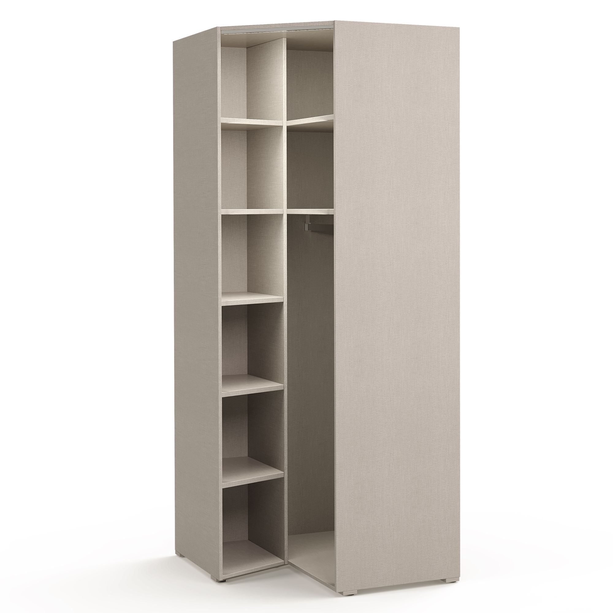 Зеркальные фасады углового шкафа BOSTON декорированы контрастной вставкой. Корпус выполнен в текстуре Шенилл, имитирующей натуральную ткань. Внутреннее наполнение представляет собой систему полок, а также отделение для вешалок с двумя полками и штангой. Шкаф оснащен внутренним светильником, срабатывающим при открывании (система включения подсветки с трансформатором и удлинитель заказываются отдельно).