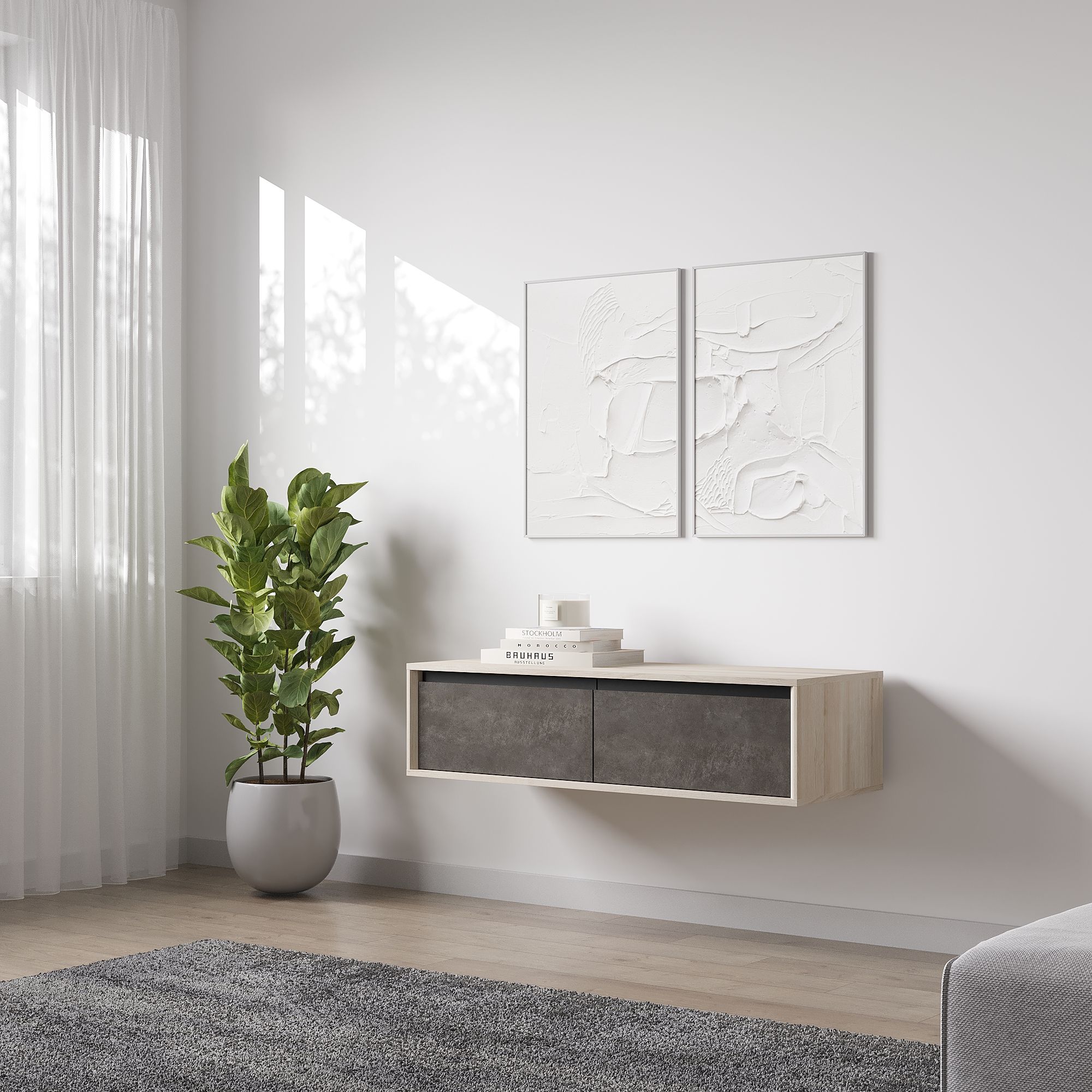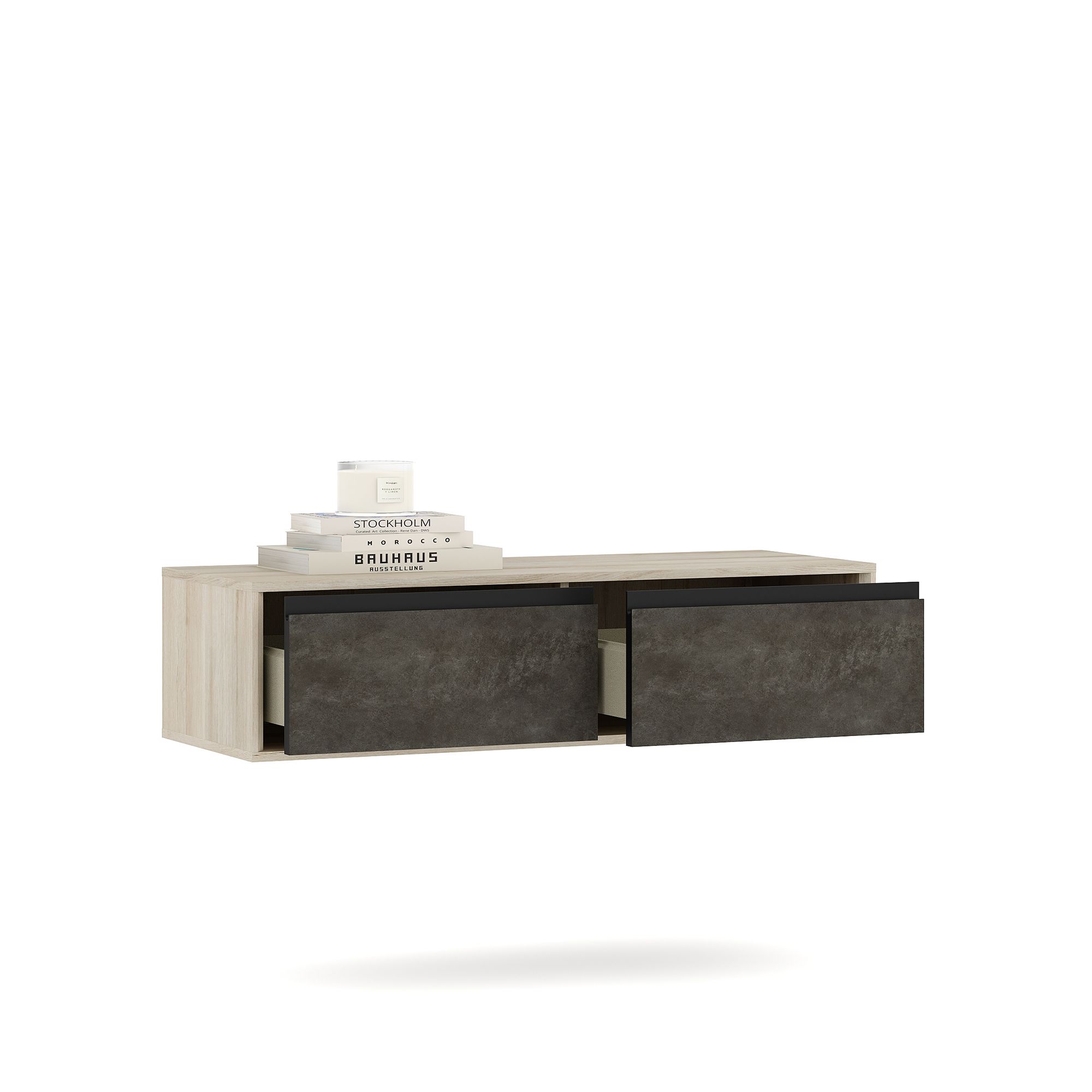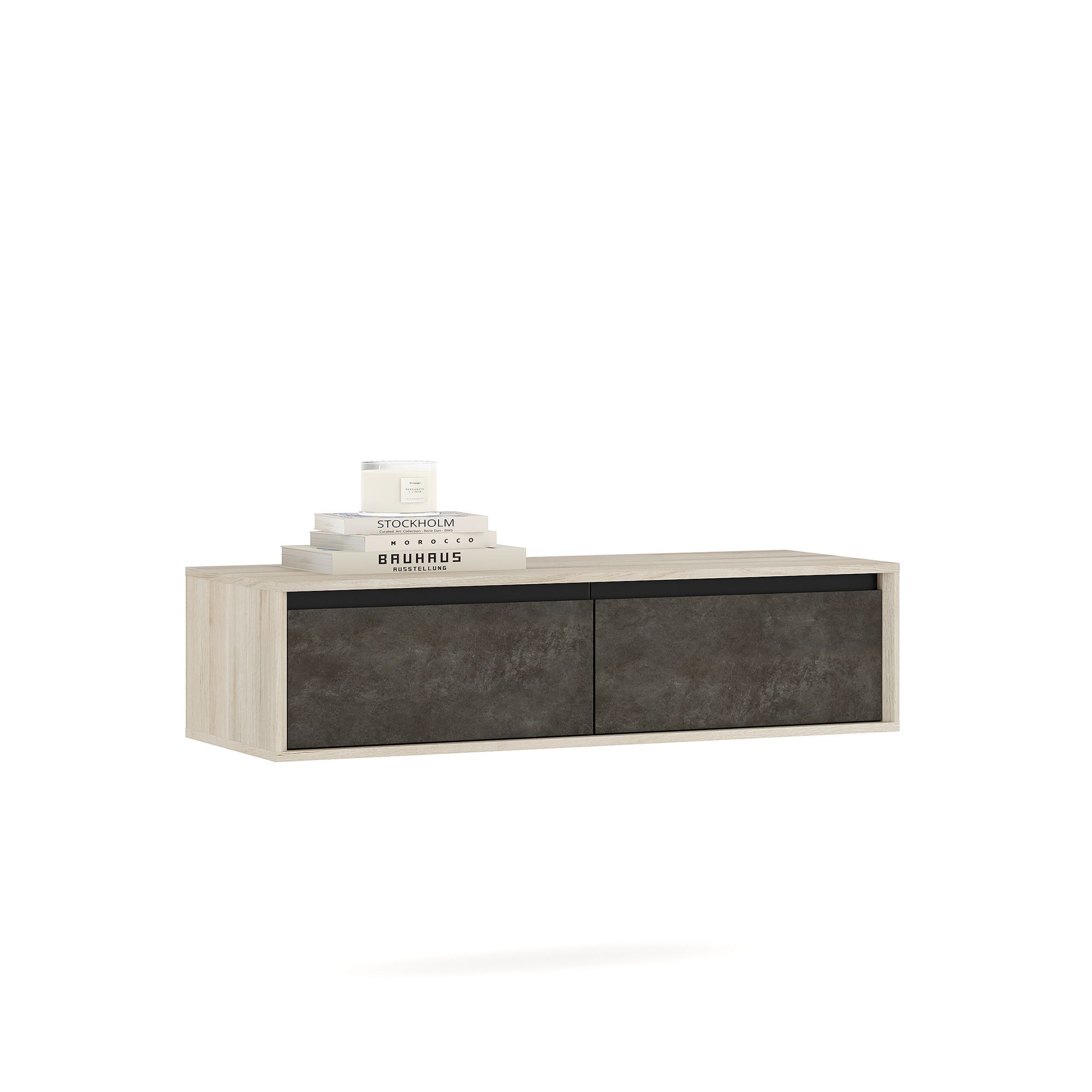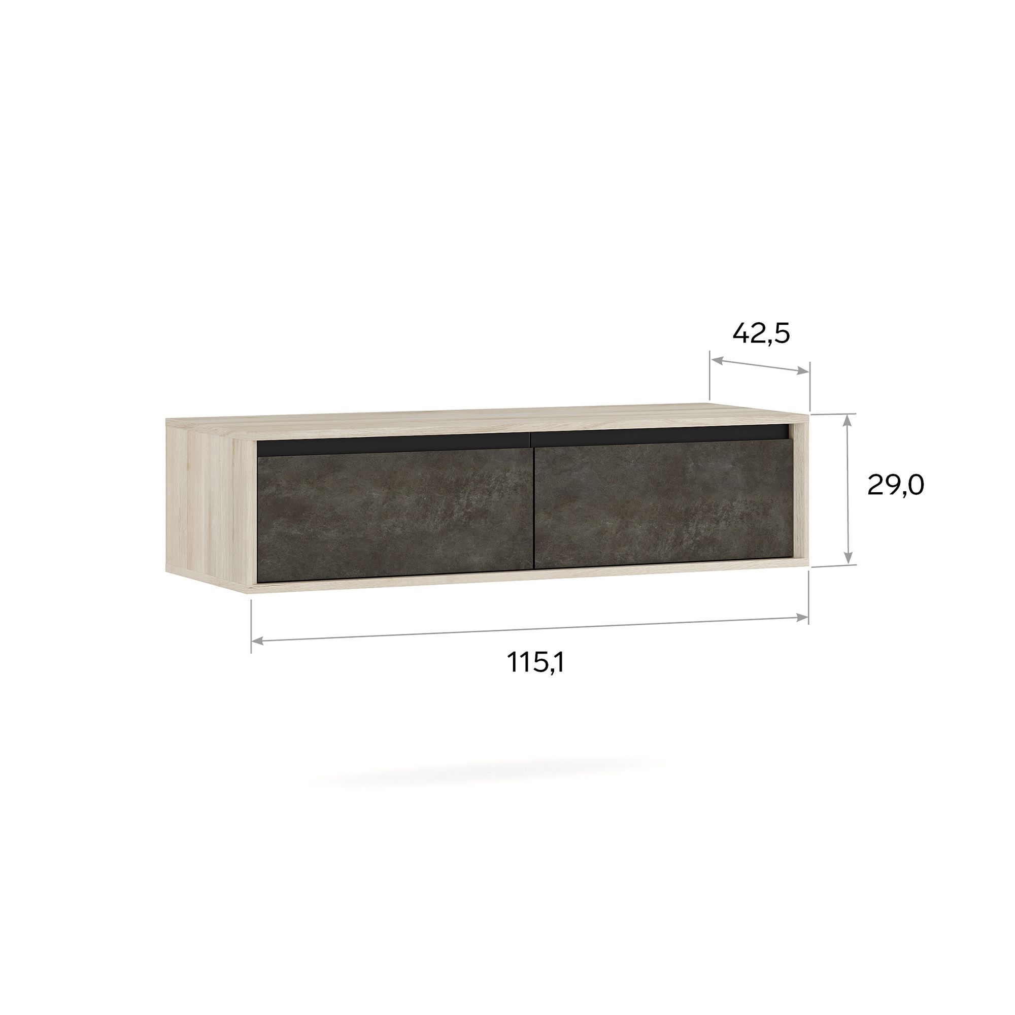 Навесной шкаф LUNA глубиной 42,5 см и шириной 115,1 см с корпусом в текстуре Дуб Anziano оснащен двумя выдвижными ящиками с интегрированными J-ручками.