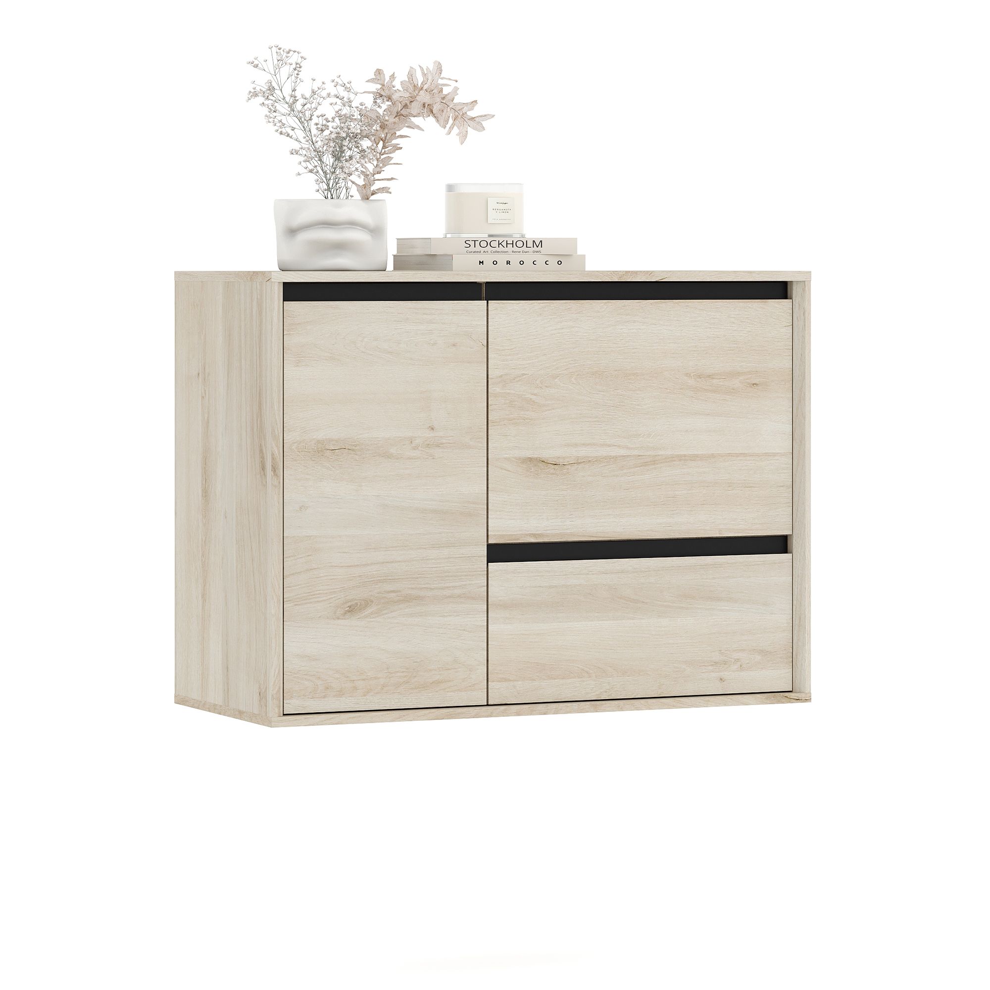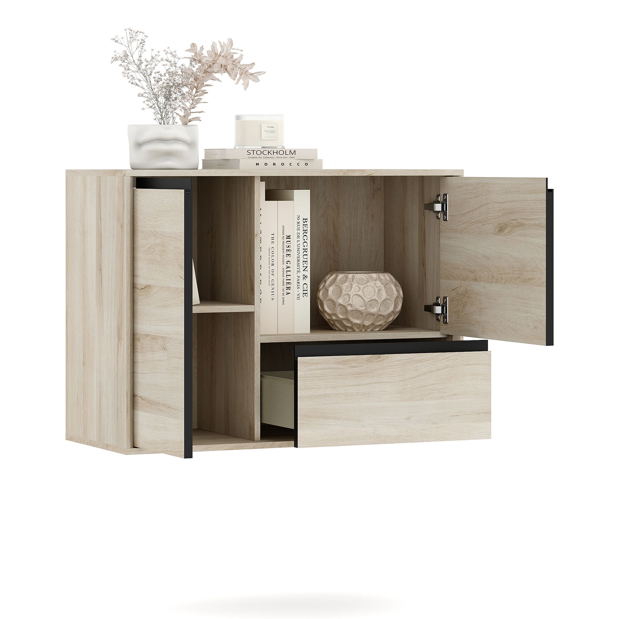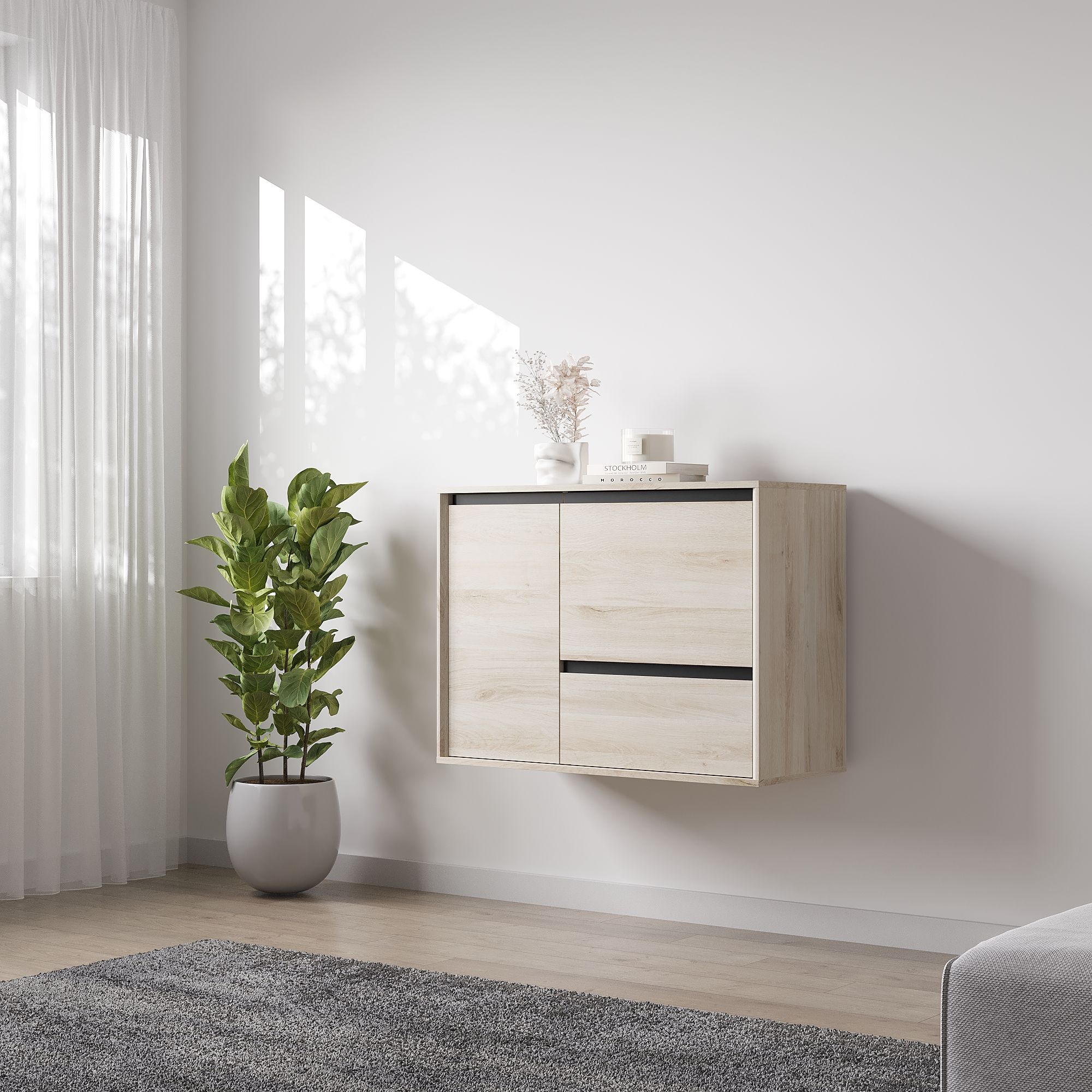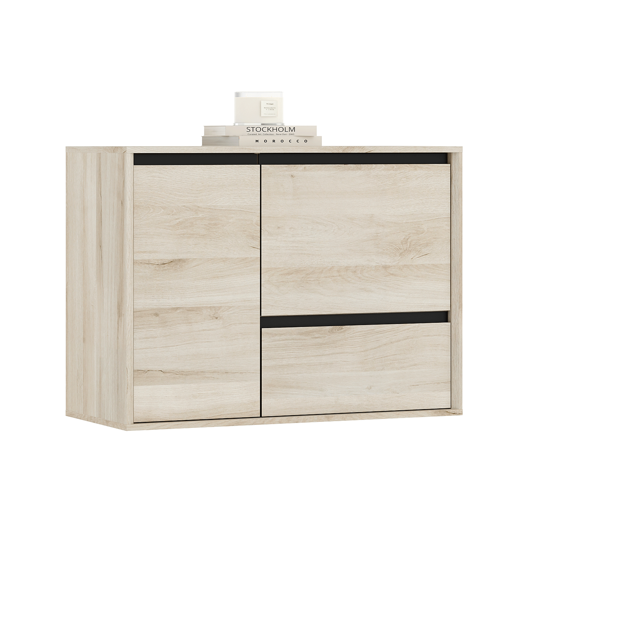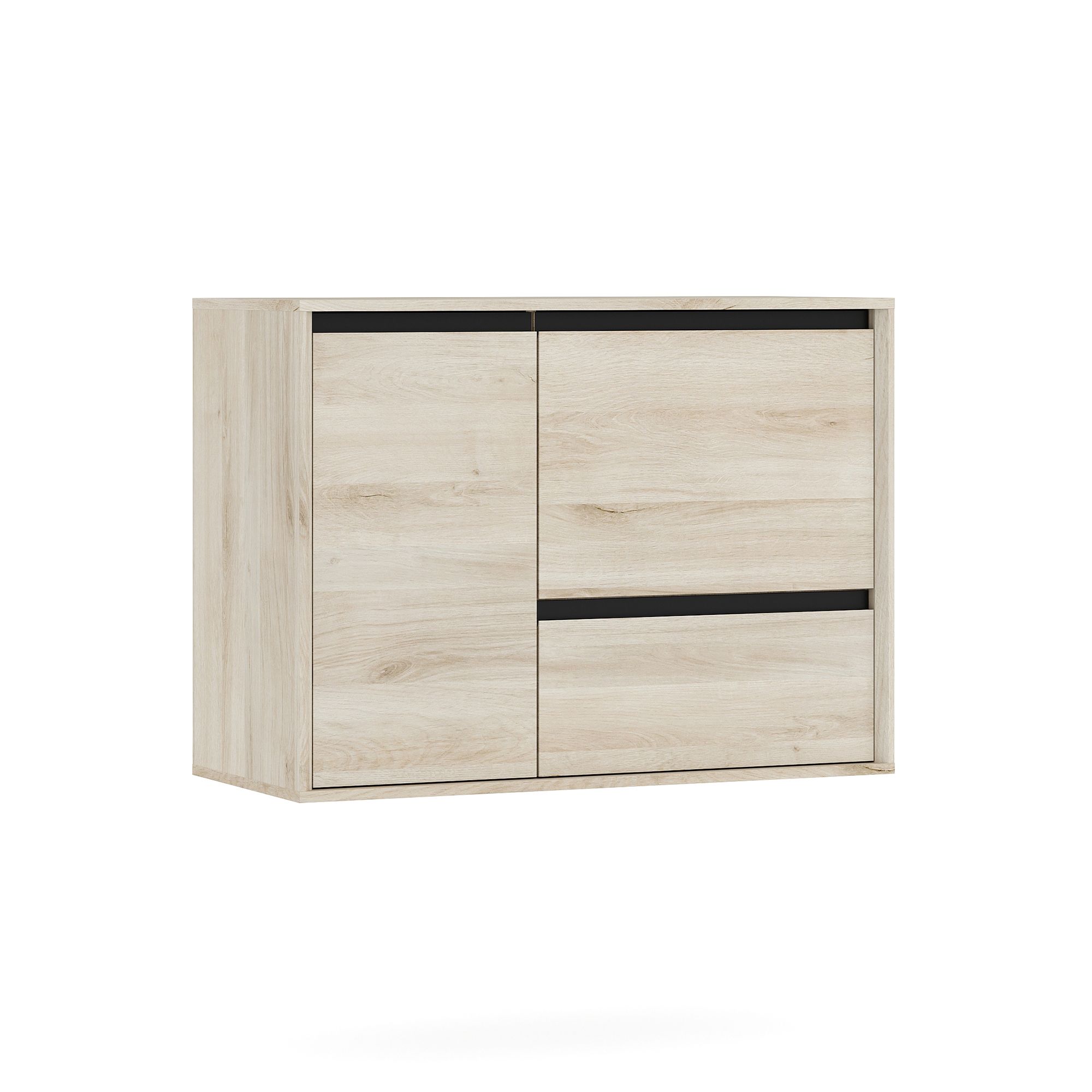 Навесной шкаф LUNA глубиной 42,5 см и шириной 95,1 см с корпусом в текстуре Дуб Anziano оснащен выдвижным ящиком и двумя распашными фасадами с интегрированными J-ручками. За одним из фасадов расположена полка из ЛДСП. Элемент имеет как правое, так и левое исполнение.