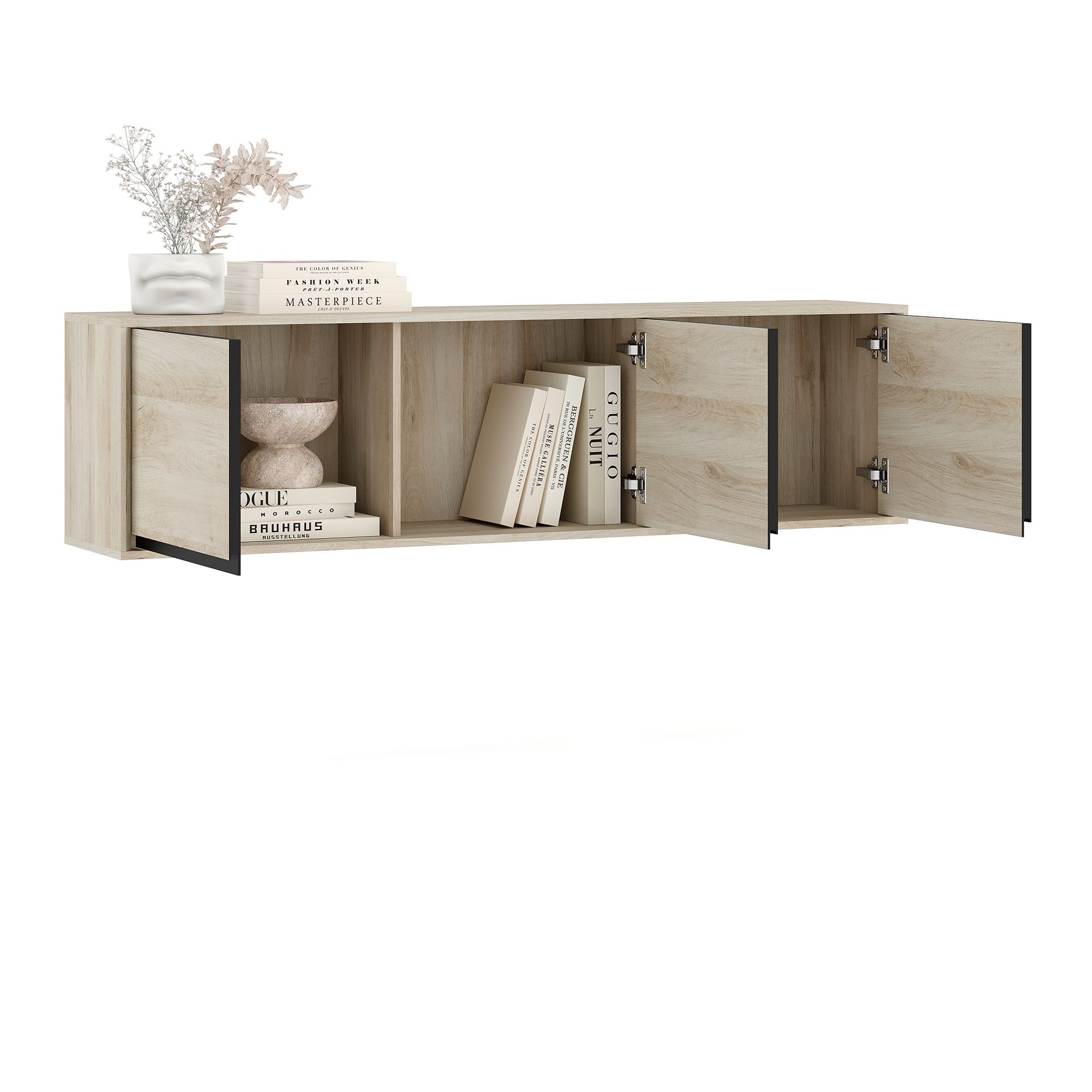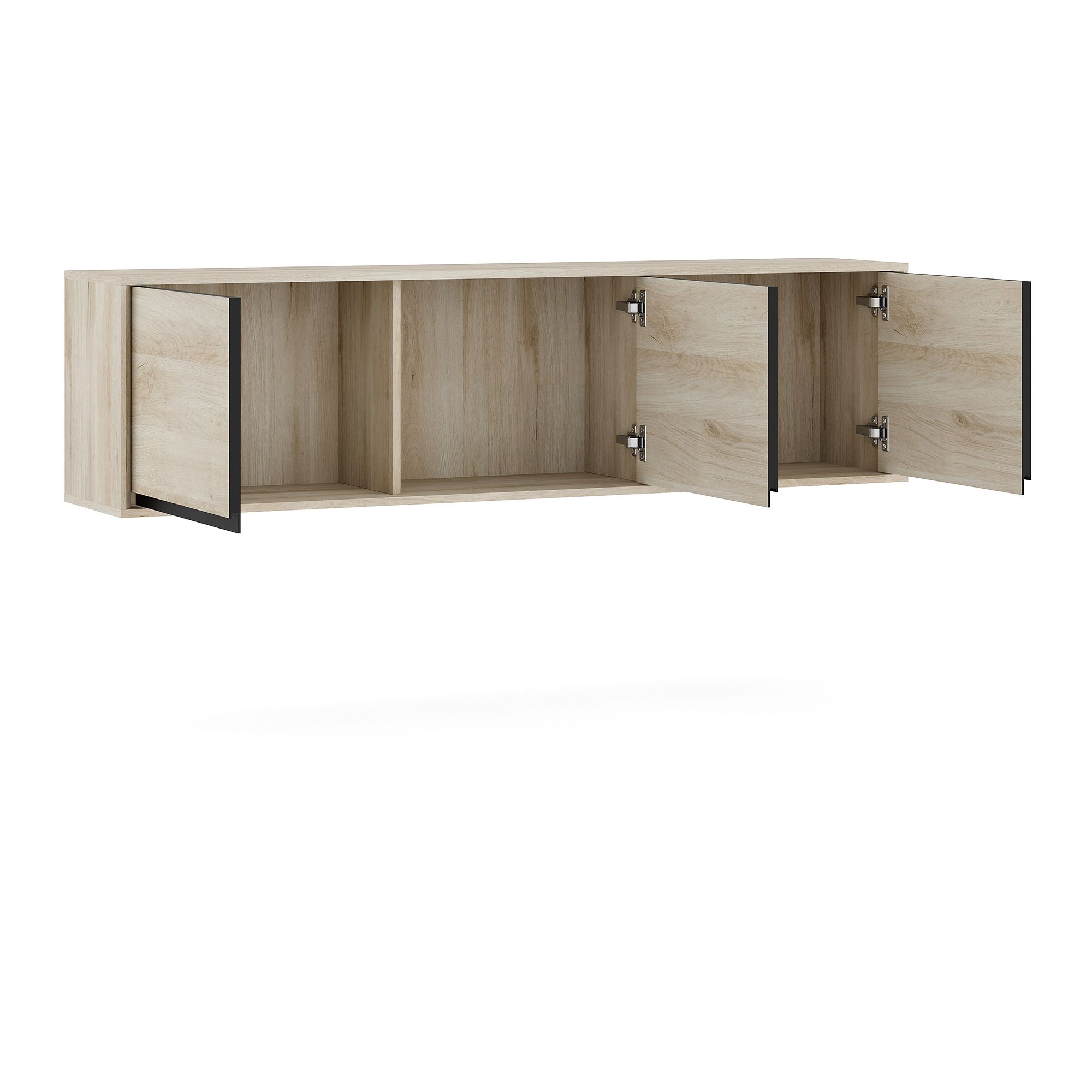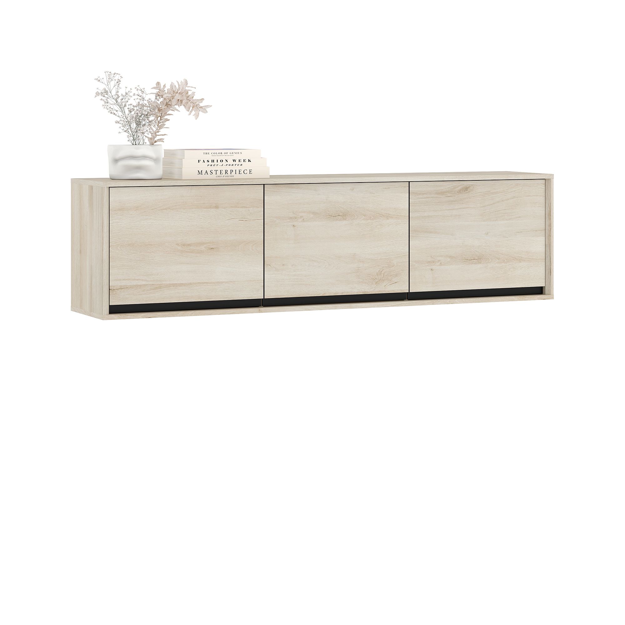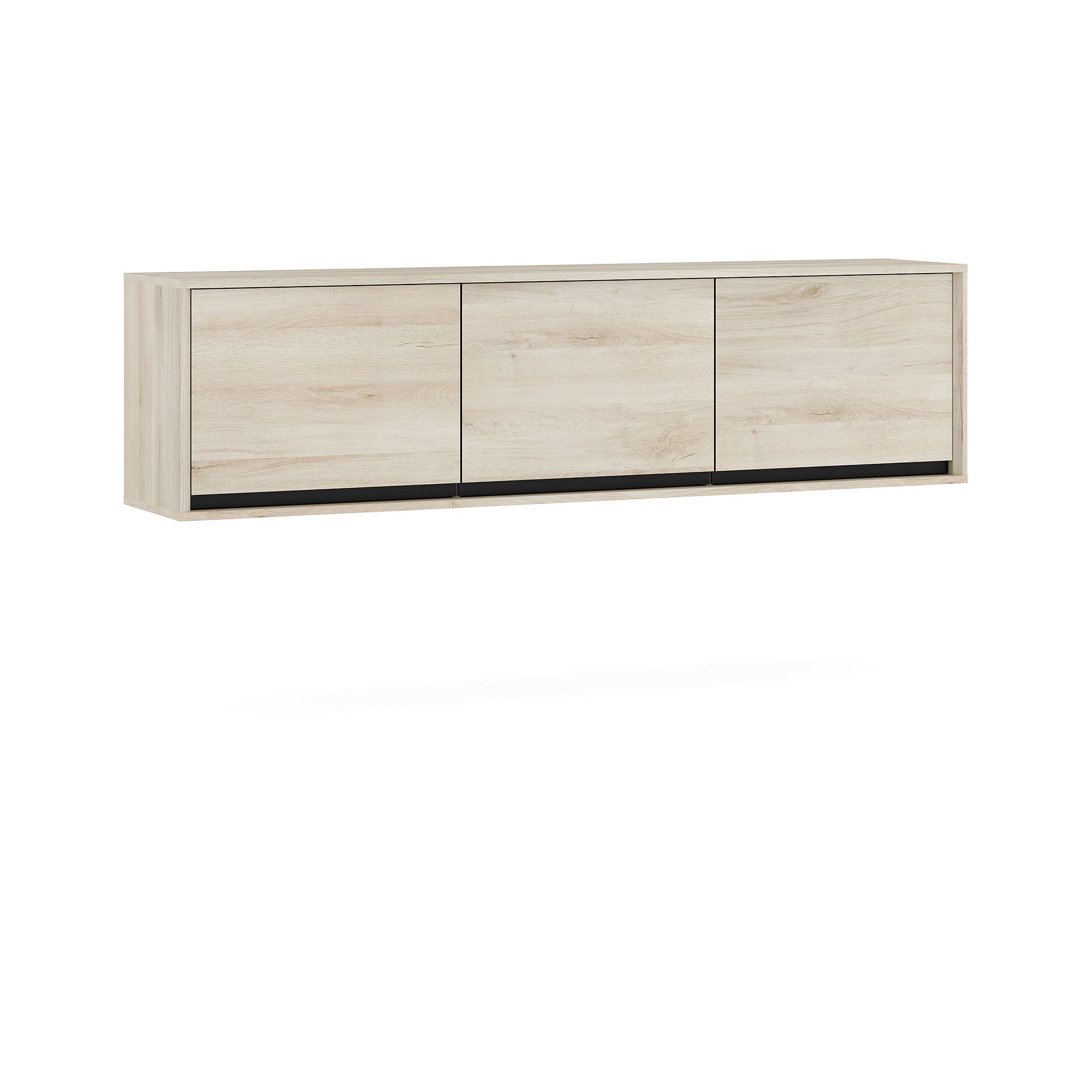 Навесной шкаф LUNA глубиной 34 см и шириной 170,1 см с корпусом в текстуре Дуб Anziano оснащен тремя распашными фасадами с интегрированными J-ручками. Максимальная допустимая распределенная нагрузка 20 кг.
